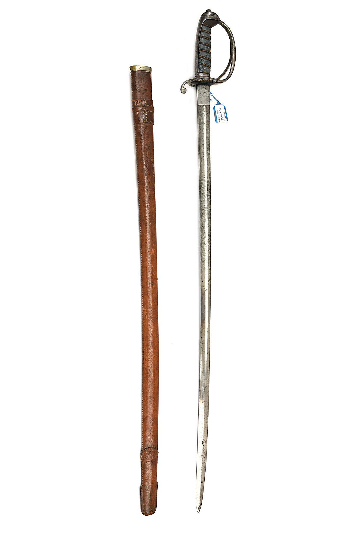 A PATTERN 1822 VICTORIAN LIGHT CAVALRY OFFICER'S SWORD, mid 19th Century, with 34 1/2 in. single-edged blade fullered and etched on each side with foliate design and royal cypher, ricasso marked for Rogers & Co. Cov. Garden, with proved plug over, steel hilt with wire-bound black fish-skin grip, together with its brown leather field scabbard, worn, etching rubbed and being faint in places, fish-skin absent above top loop of wire binding, scabbard with solid stitching but some grazing and frog strap broken