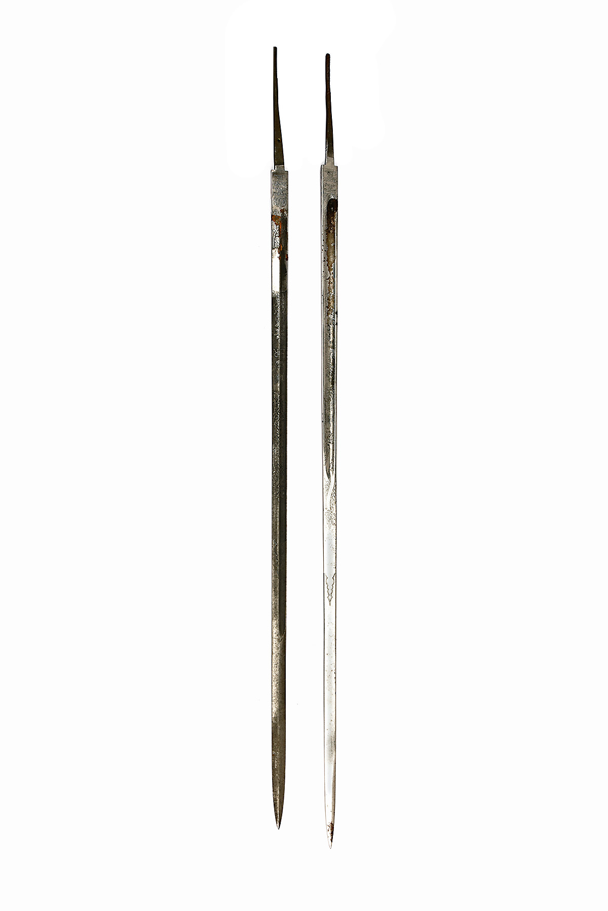 A PAIR OF ELIZABETH II ETCHED WILKINSON SWORD BLADES, being 1) serial number 114178 (dates to 1983), 31 in. naval blade, etched on both sides with ropes and oakleaves, royal cypher to one side and crown above fouled anchor over; 2) serial number 110565 (dates to 1980), 32 1/2 in. RAF blade, etched on both sides with foliate banners, royal coat-of-arms to one side and crown above eagle over; both stained with some surface rusting (2)