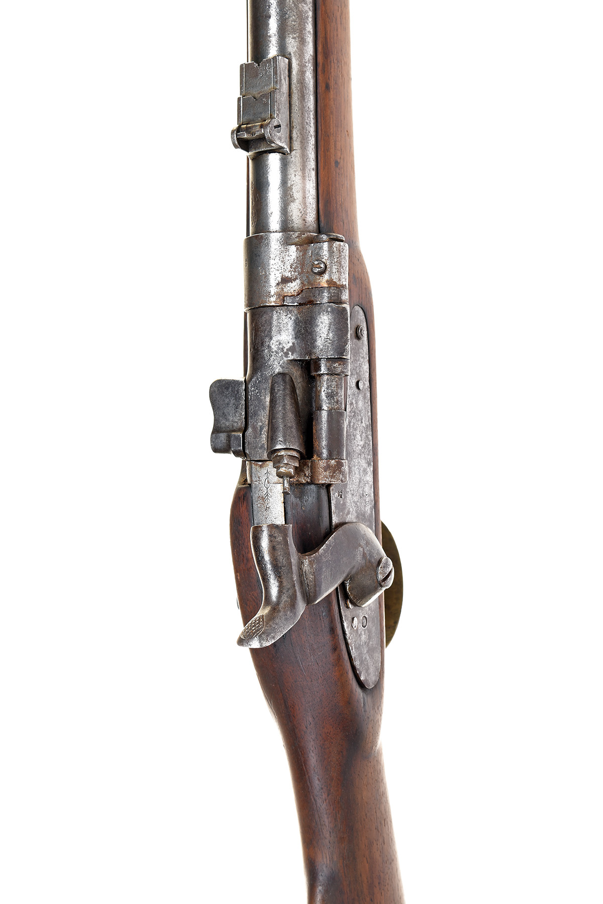 * A .577 SNIDER CARBINE, serial no. L13G, Belgian manufacture, with sighted 19in. barrel, flip-open breech, lock with added registration number and walnut half-stock with brass furniture, single iron barrel-band and no provision for clearing rod, finish worn