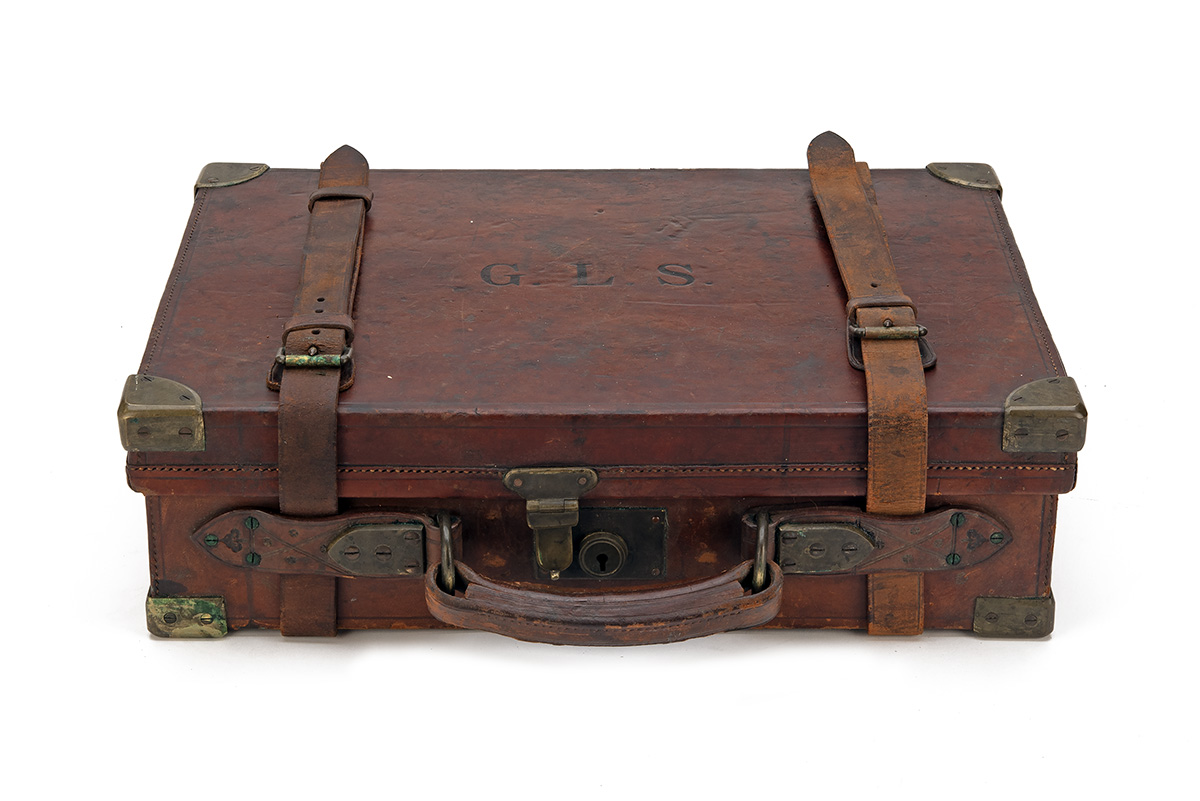 A BRASS-CORNERED OAK AND LEATHER CARTRIDGE MAGAZINE,