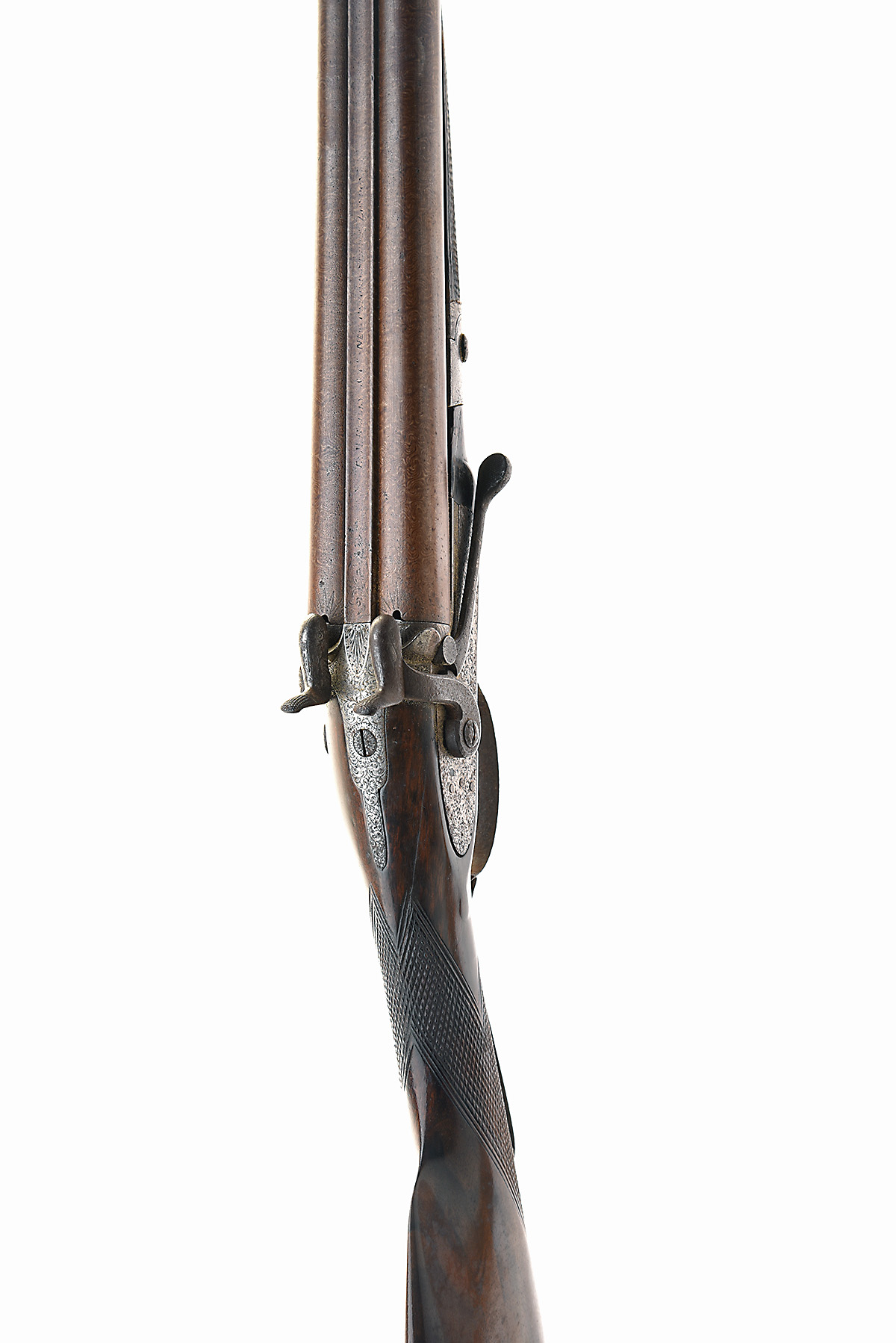 A 12-BORE PINFIRE E.M REILLY SPORTING-GUN WITH TRIGGER GUARD SAFETY, serial no. 13394, circa 1870, with re-browned 28 1/4in. barrels, side-lever opening action also lifting the hammers via a cam, walnut butt-stock and fore-end, iron furniture including grip safe, worn with small losses