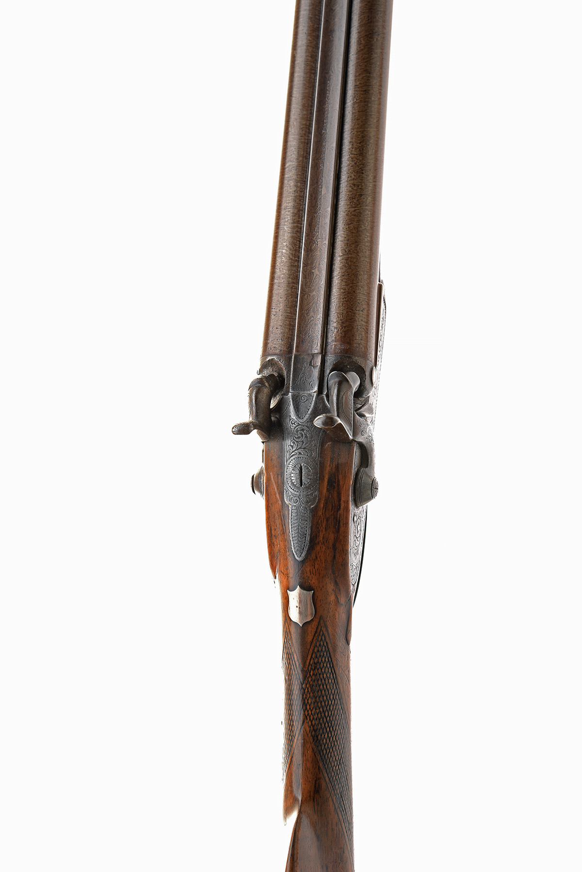 A 14-BORE PERCUSSION DOUBLE-BARRELLED SPORTING-GUN SIGNED B. THERSFIELD, no visible serial number, circa 1850, with 29 1/4in. browned barrel signed on the top-rib (rib lifting), nickel plugs, border, scroll and gamescene engraved bar-action unsigned locks, chequered walnut half-stock (worn, repairs around locks) and under-barrel ramrod