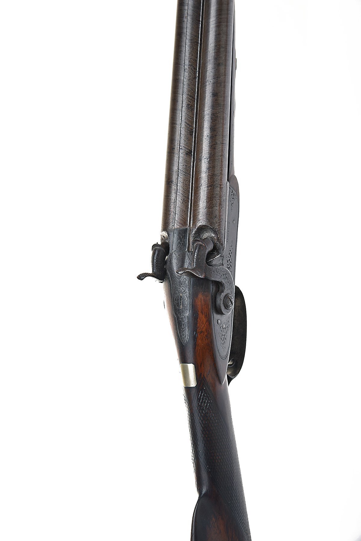 A 16-BORE PERCUSSION DOUBLE-BARRELLED SPORTING-GUN SIGNED ANDERSON, no visible serial number, circa 1855, with 30in. barrels, borderline and scroll engraved signed bar-action locks, chequered walnut half-stock (worn) and replacement ramrod