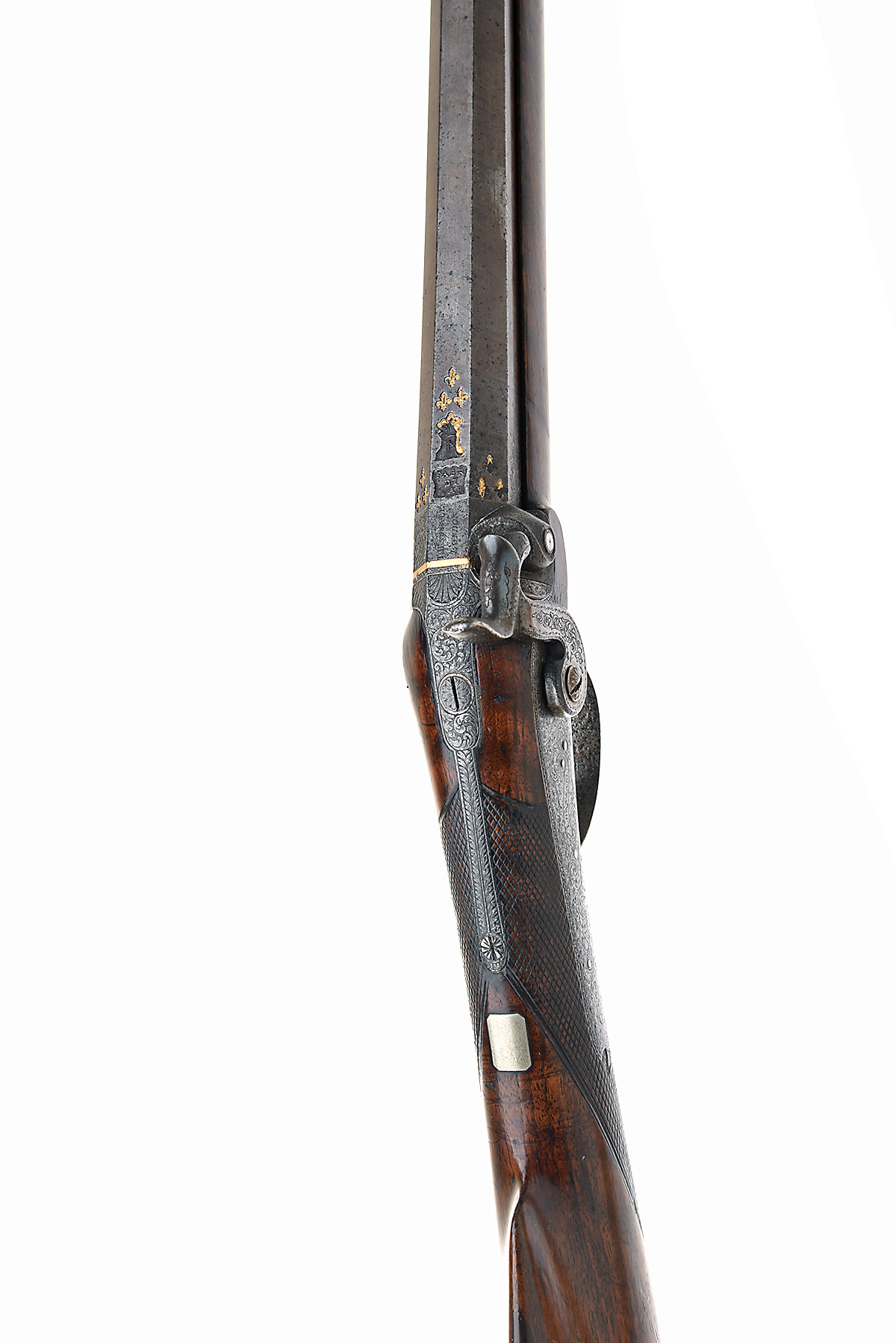 AN 18-BORE PERCUSSION SINGLE-BARRELLED SPORTING-GUN SIGNED T. HASSALL, no visible serial number, circa 1835 and using a pre-existing 44in. Spanish barrel, signed breech and back-action lock, replacement hammer, walnut half-stock and replacement ramrod
