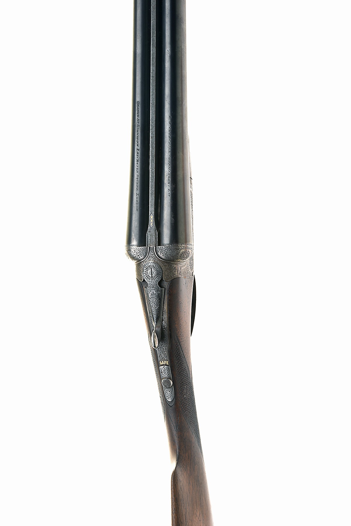 E.J. CHURCHILL 12-BORE BOXLOCK EJECTOR, serial no. 4252, for 1930, 25in. nitro barrels with Churchill-rib gold-inlaid 'XXV', tubes engraved 'E.J. CHURCHILL (GUNMAKERS) LTD. ORANGE ST. GUNWORKS. LEICESTER SQUARE. LONDON.', 2 1/2in. chambers, bored approx. imp. cyl. and 1/4 choke, treble-grip action with hidden third bite, automatic safety with gold-inlaid 'SAFE' detail, border and acanthus scroll engraving with floral bouquets, the underside engraved 'UTILITY MODEL' and gold-inlaid 'XXV', 15in. stock including 1 3/4in. wooden extension and distressed recoil pad weight 6lb, with canvas and leather single gun case