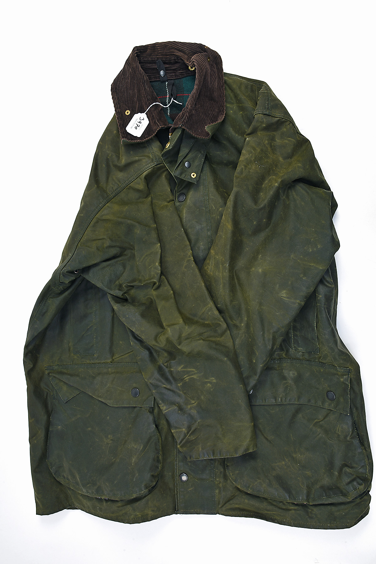 A 'BARBOUR' NORTHUMBRIA WAXED JACKET, sylkoil waxed cotton, tartan lined inner, corduroy collar in green, size C46/117CM