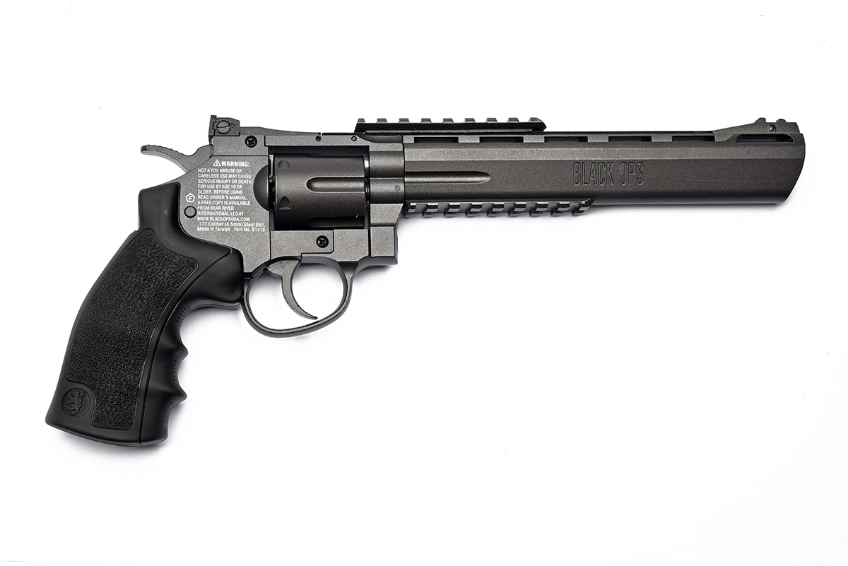 A .177 BLACK OPS CO2 POWERED AIR-PISTOL, serial no. 14G09982, with 8in. ported barrel, swing-out cylinder, double action mechanism and stippled black plastic grip, untested