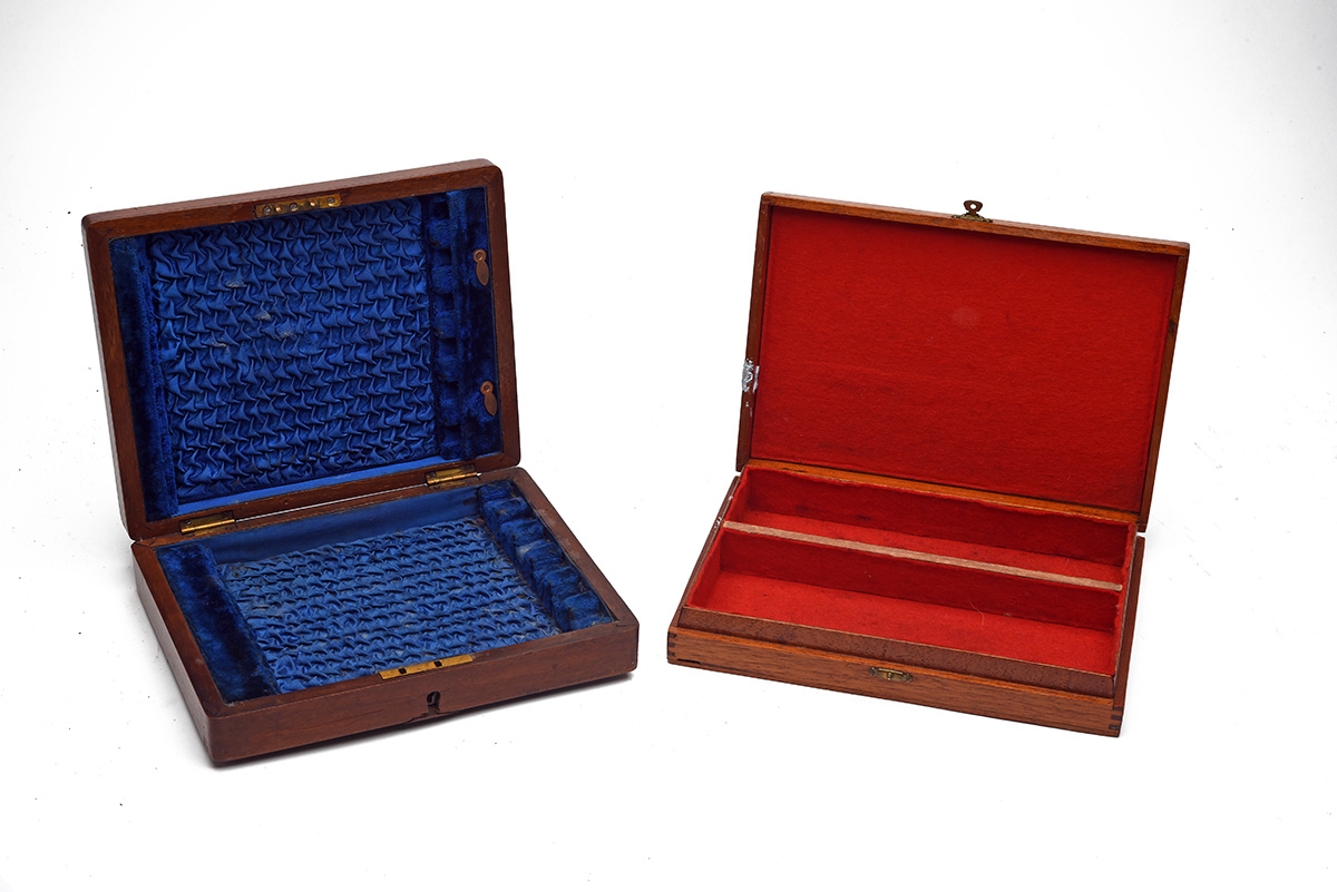 FOUR VARIOUS WOODEN CASES, 1 approx. 12 1/2in. x 7in. x 2in. with handle, 1 approx. 10in. x 7in. x 1 1/2in. red cloth lined, 1 approx. 9 3/4in. x 7 3/4in. x 2 1/4in. plain brass escutcheon on lid, fitted for cutlery, 1 approx. 13 3/4in. x 5in. x 3in. labelled 'BATY LONDON' (4)