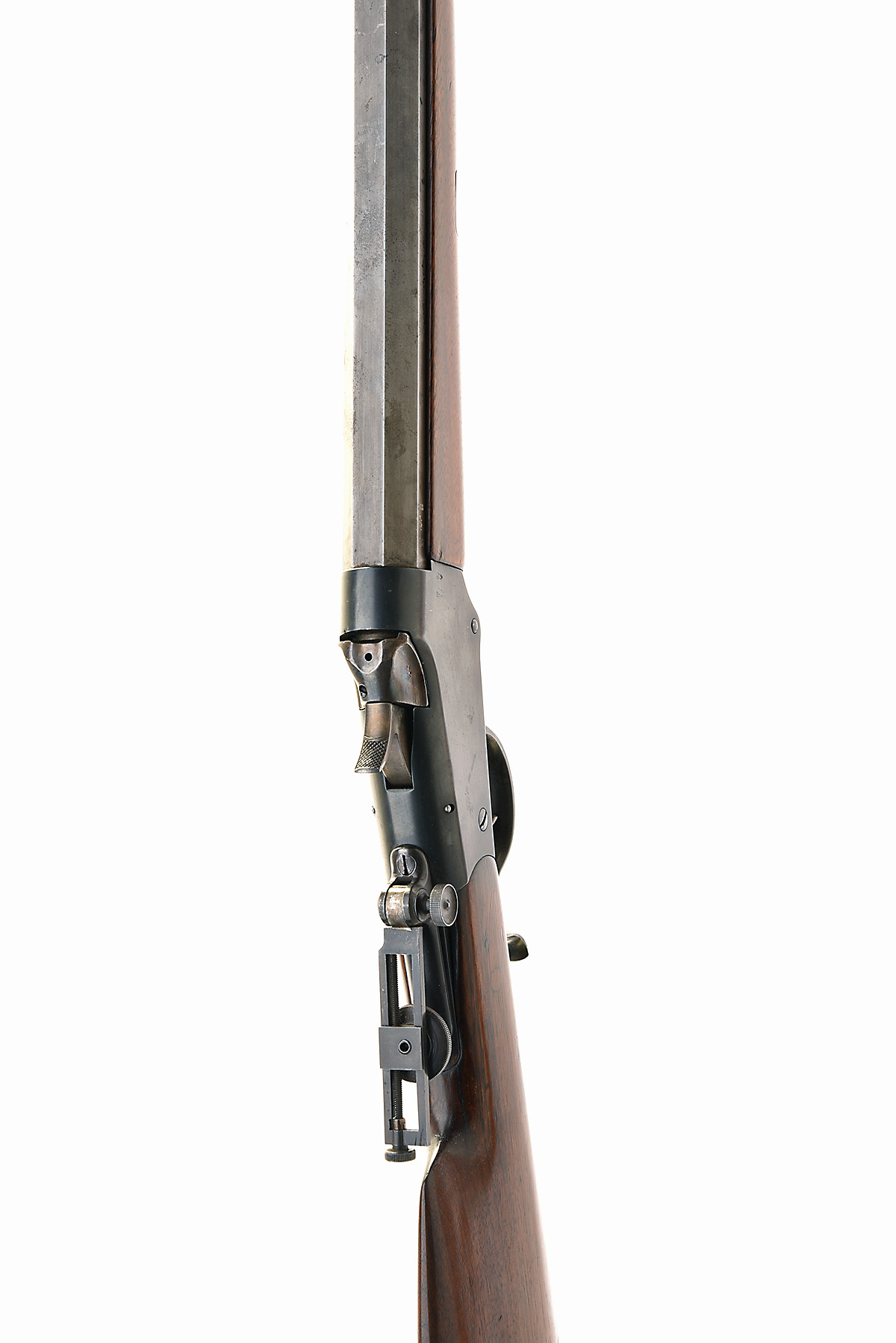 * WINCHESTER REPEATING ARMS CO. .44-40 (WIN.) 'MODEL 1885 LOW WALL' SINGLE-SHOT RIFLE, serial no. 93599, for 1905, 31 1/2in. turned octagonal to round nitro reproved replacement barrel (in 2025), dove-tailed bead foresight, in the white finish, receiver fitted with a folding aperture rear sight, plain reblued slab-sided falling block action, 13 1/4in. stock including steel buttplate, splinter fore-end, weight 8lb. 6oz.