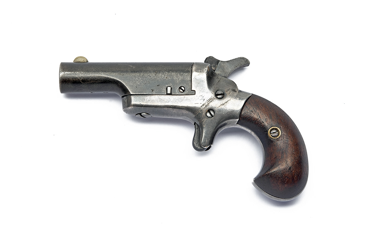 * A .41 RIMFIRE SINGLE-SHOT COLT NUMBER 3 DERRINGER PISTOL, serial number 21294, late 1890s, with 2 1/2 in. sighted blued barrel engraved 'COLT', London proofs, side swing breech opening, nickelled frame, walnut bird's head grips, some light pitting to the barrel, action at fault, 5 in. overall length