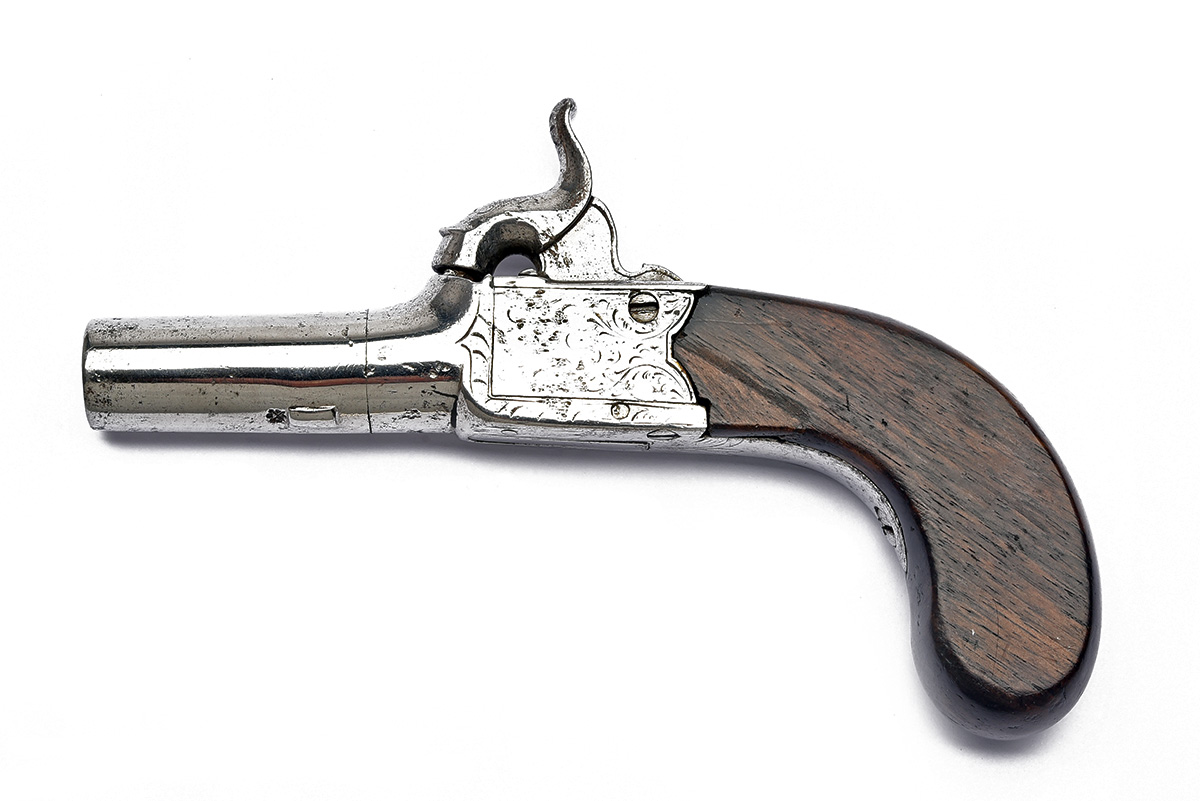 A 54-BORE BOX-LOCK PERCUSSION PISTOL, SIGNED EGG?, no visible serial number, circa 1830 percussion conversion of a circa 1810 flintlock, with 1 3/4 in. barrel, Birmingham proof-marks, box-lock with a heavily rubbed name on the left side (possibly Egg) with rubbed 'London' over, slab-sided butt with blank oval white metal escutcheon, dolphin hammer, drop-down trigger, worn, barrel frozen, has a modern nickelling over pitted and heavily scrubbed metalwork, leaving the engraving weak and script indistinct, butt shrunken with a crack between the lock tang and the escutcheon; plus two Sykes Patent sporting powder flasks, both damaged with split seams and crushed spouts, one heavily dented and in semi-relic condition 3