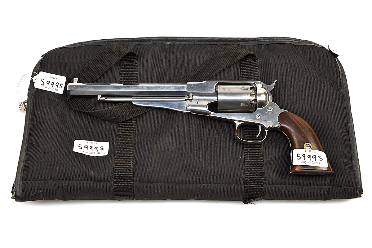 A REPRODUCTION .44 PIETTA REVOLVER, MODEL 'REMINGTON NEW MODEL', serial no. A3908, with 8in. stainless steel octagonal barrel, stainless steel solid frame and plain cylinder, smooth walnut grips in canvas fleece-lined slip
