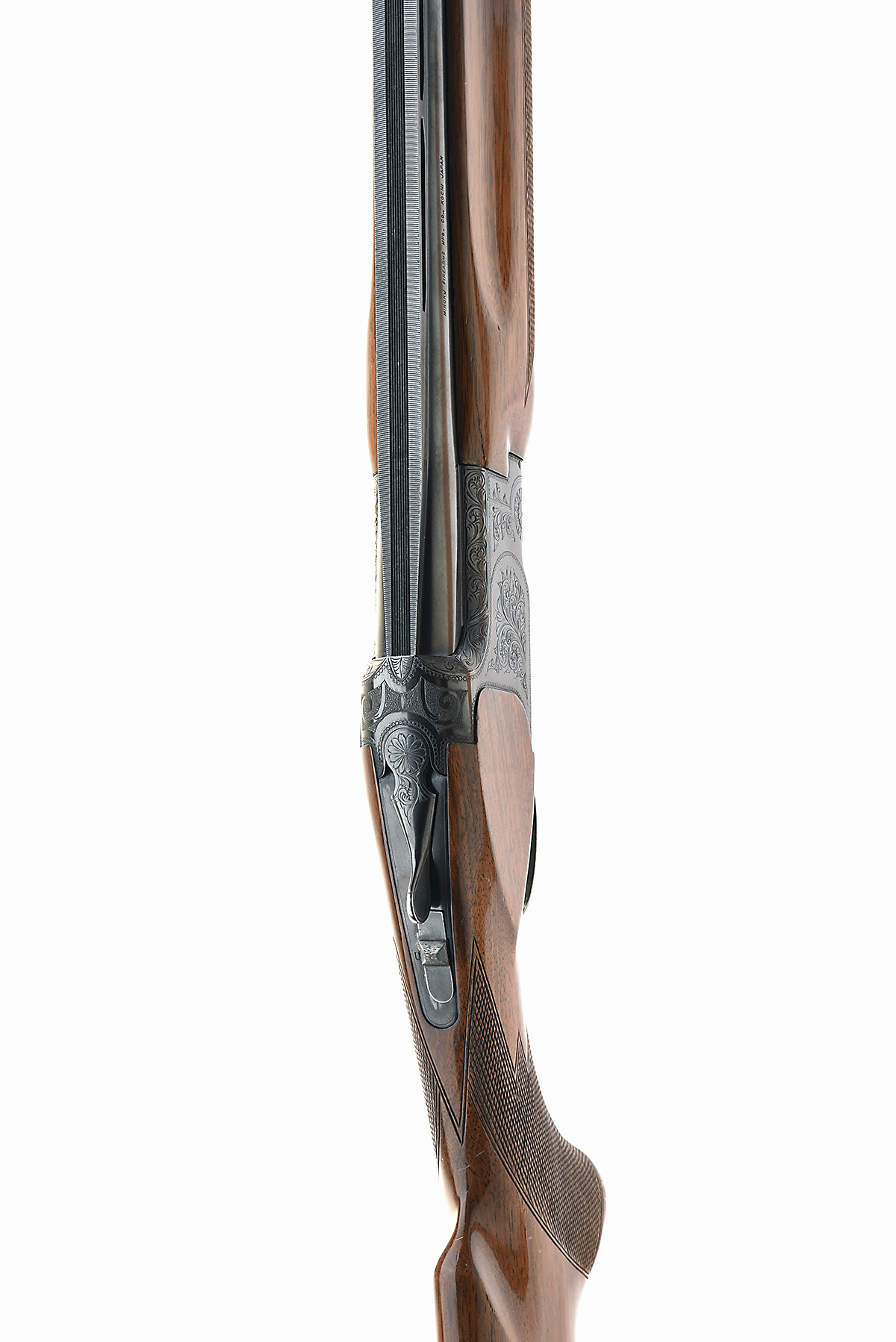 B.C. MIROKU 12-BORE SINGLE-TRIGGER OVER AND UNDER EJECTOR, serial no. 679612, circa 1979, 28in. nitro barrels with 15mm ventilated matt top-rib, 2 3/4in. chambers, bored approx. true cyl. in both, hold-open toplever, manual safety with integral barrel selector switch, gold-washed single trigger, beaded border and acanthus scroll engraving, 14 1/2in. pistolgrip stock including buttplate, weight 8lb.
