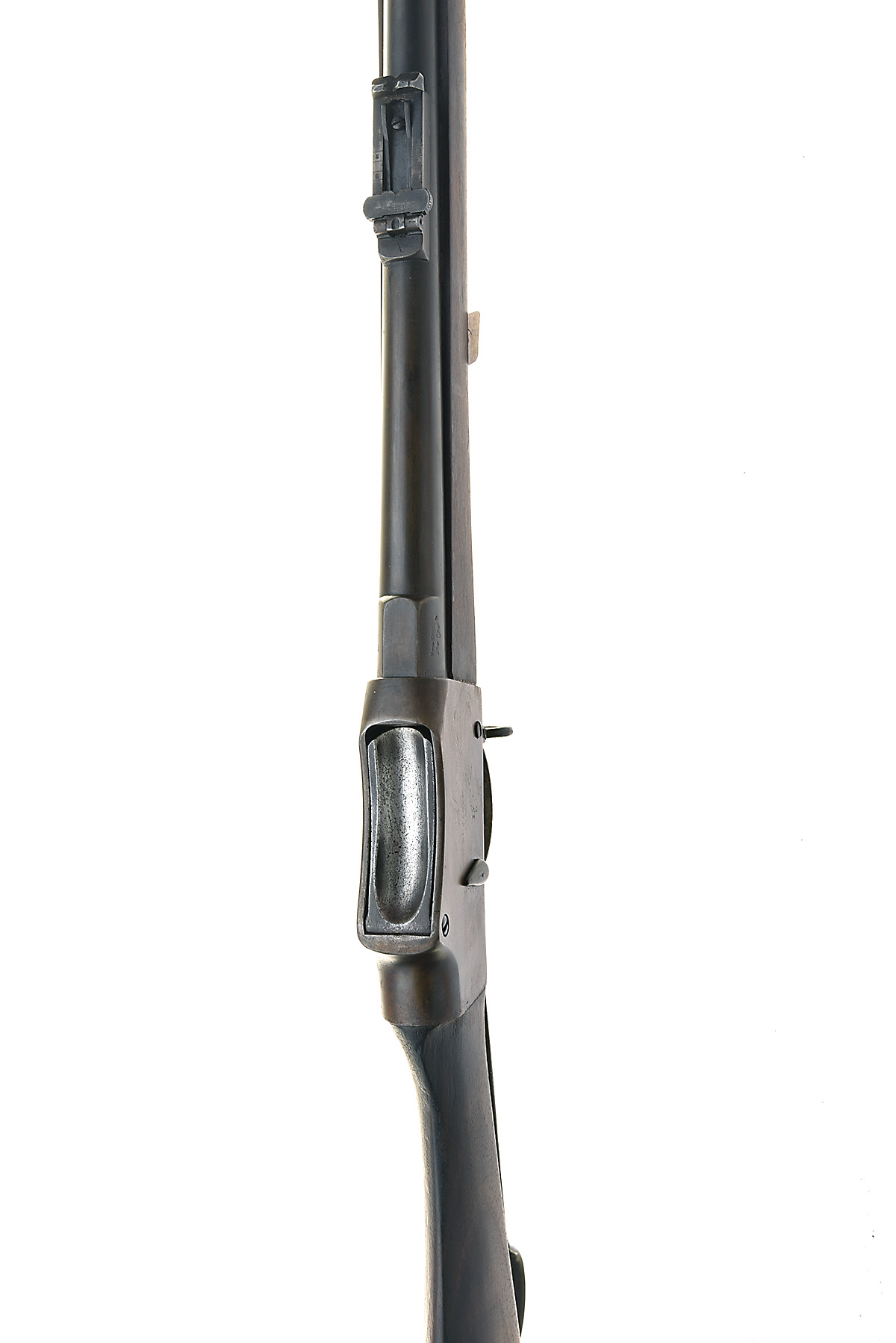 A .577/450 MARTINI-HENRY MARK IV PATTERN C SERVICE RIFLE SIGNED ENFIELD, no visible serial number, dated 1886, with 32 1/2 in. signed barrel stamped 'N . S / N E P' [for Native Service, Nepal] below ladder-sight, inspection and proof-marks, falling block action, right side of receiver with crown over 'V . R / ENFIELD / 1888' with viewer's mark over 'IV / 1', with inspection marks over, small cocking indicator, walnut stock, butt stamped with roundel and 'RP / 10 / 1902' plus Nepalese unit markings, complete with both sling swivels and clearing rod, worn, original finish poorly removed leaving staining, stock heavily rubbed, lever cup damaged, rear barrel band poorly fitting and appears glued in place, 48 3/4 in. overall