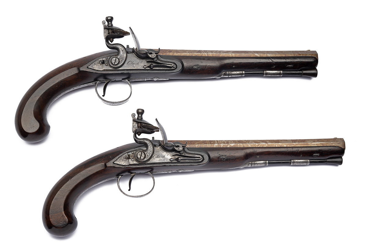 circa 1785, with rebrowned slightly swamped octagonal 9in. barrels, the top-flats signed in script 'CLARK, HOLBORN LONDON', London proofs, gold-lined touch-holes, twin engraved bands at breeches, white metal fore-sights at muzzles and shallow standing notch rear-sights to the engraved top-tangs, flat step-tailed locks with carved borders and signed 'CLARK' below the shallow pans, swan-necked cocks with safes, roller frizzens, walnut full-stocks with semi slab-sided grips, guarded single set triggers and horn-tipped under-barrel ramrods, in a dark oak period casing lined and compartmented in green baize (trade label removed) and including a flask, turn-screw, wad-punch, scissors mould and later loading-rod