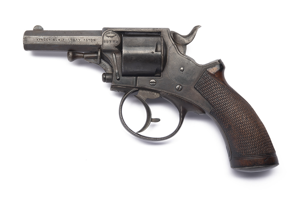 circa 1874, with octagonal 3in. barrel, engraved band at muzzle, crescent fore-sight, the left side of barrel marked 'KYNOCH GUN FACTORY, ASTON', borderline engraved solid frame 'pear-shaped ejector, plain five-shot cylinder with recessed locking notches, double action mechanism and chequered walnut semi saw-handled walnut grip with shallow domed iron pommel-cap