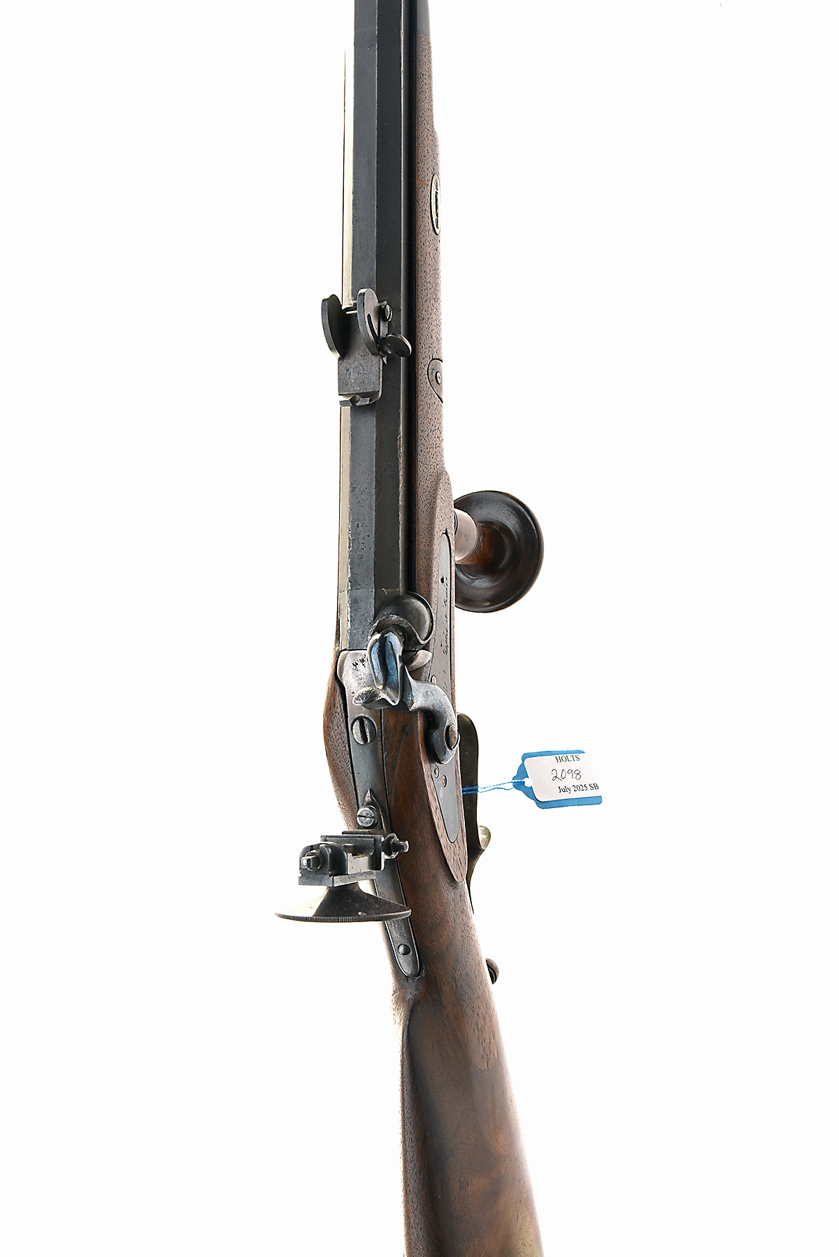 A 10mm PERCUSSION CONTINENTAL TARGET-RIFLE, SIGNATURE OBSCURED, no visible serial number, probably Swiss or German circa 1850, with heavy octagonal 32 1/4in. barrel, recessed muzzle, tunnel fore-sight, elevating tangent rear-sight, plain top-tang with adjustable peep-sight, hump-backed lock with traces of signature, walnut Swiss-style half-stock (expertly repaired at wrist), iron furniture, double set trigger and under-barrel ramrod and mushroom palm-rest, restored throughout