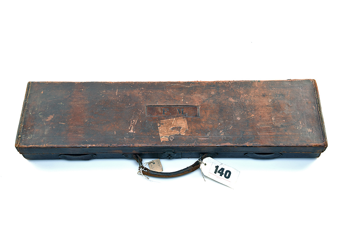 A LEATHER SINGLE GUNCASE, fitted for 30in. barrels, the interior lined with red baize, a Holland & Holland trade label (copy), brass lock (key missing)