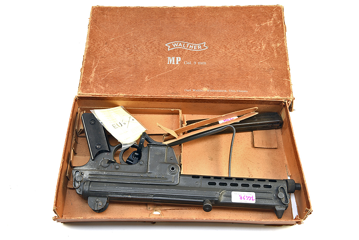 A DEACTIVATED MANURHIN -MULHOUSE 9MM PARA 'MODEL WALTHER MPL' SUBMACHINE GUN, serial no. 11727 / 10003, circa 1965, 10in. barrel with ported metal shroud, post fore-sight, open rear sight, detachable box magazine, folding skeletal stock, in its original makers cardboard box, together with its EU deactivation certificate