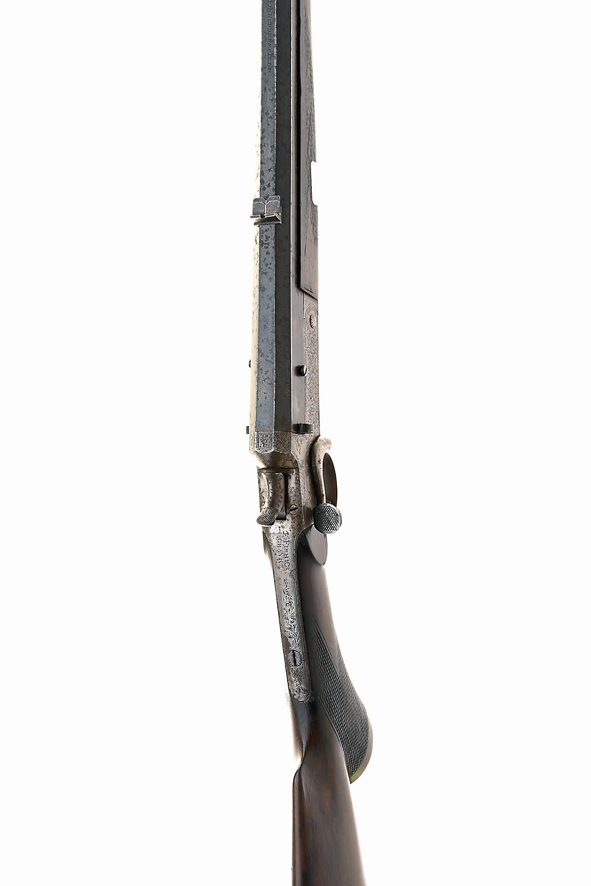WILLIAM GOLDEN .300 (ROOK) SINGLE-BARRELLED SIDELEVER HAMMER ROOK & RABBIT RIFLE, serial no. 63050, circa 1890, 28 5/8in. octagonal barrel, open rear sight with two folding leaves with white metal inlaid sight lines, dove-tailed bead fore-sight, the top flat engraved 'WILLIAM GOLDEN. MAKER. HUDDERSFIELD.', sidelever opening, central rebounding hammer, non-selective ejector, the top strap engraved 'E. FISHER. CRAYKE.', border and bold acanthus scroll engraving, 14 1/2in. figured pistolgrip with horn pistolgrip cap, snap-on splinter fore-end with horn finial (seized on, but loose)