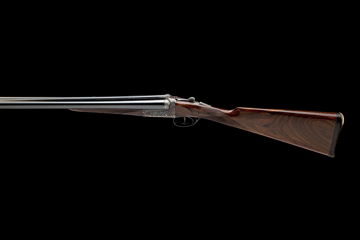 for 1989, 28in. nitro chopperlump barrels, the rib engraved in script 'The "Cavalier"' and with acanthus scrollwork at the breech end, the tubes engraved 'HOLLAND & HOLLAND. 33 BRUTON STREET, LONDON.' and with scrolled bands at the breech ends, 2 3/4in. chambers, bored approx. 1/4 choke in both, scroll-back action, automatic safety with gold-inlaid 'SAFE' detail, rolled-edge triggerguard, bold acanthus scroll engraving with a partially matted background, the sides engraved with the makers name in scrolling banners, the floorplate with the model designation, retaining much original colour-hardening and some finish, 16in. boldly-figured stock with diamond grip and including 5/8in. leather covered recoil pad, weight 6lb. 13oz., in its lightweight leather case with some accessories