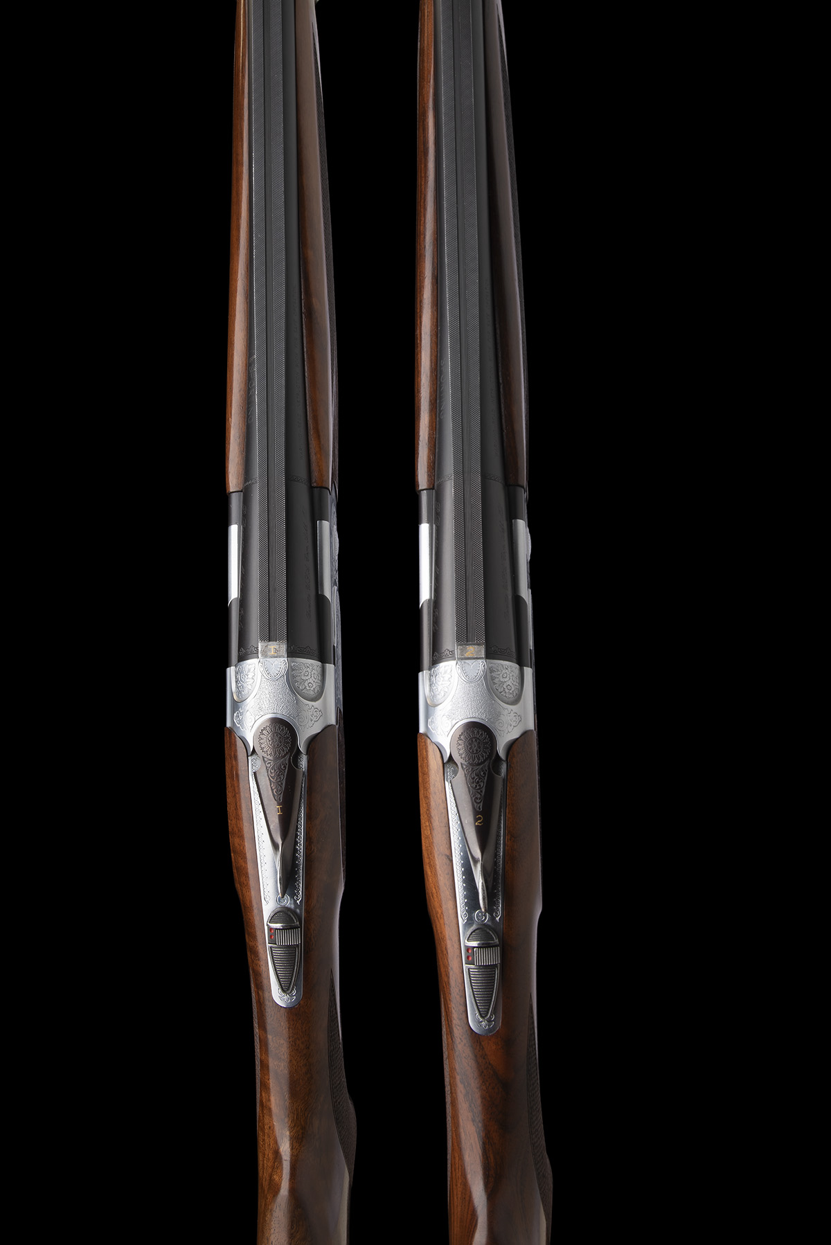 for 2000, 28in. nitro barrels with 12mm ventilated matt top-ribs, marked 'I' and '2' at the breech ends, 3in. chambers, multichokes (no spares), hold-open toplevers gold-inlaid 'I' and '2', automatic safeties with integral barrel selector switches, gold-washed triggers, floral and scroll engraving with game scenes of partridge and duck, bright finish, 13 3/8in. pistolgrip stocks including recoil pads (slight movement No.1), weight 7lb. 6oz. (No.1) and 7lb. 5oz. (No.2), in a green double fleece-lined canvas slip