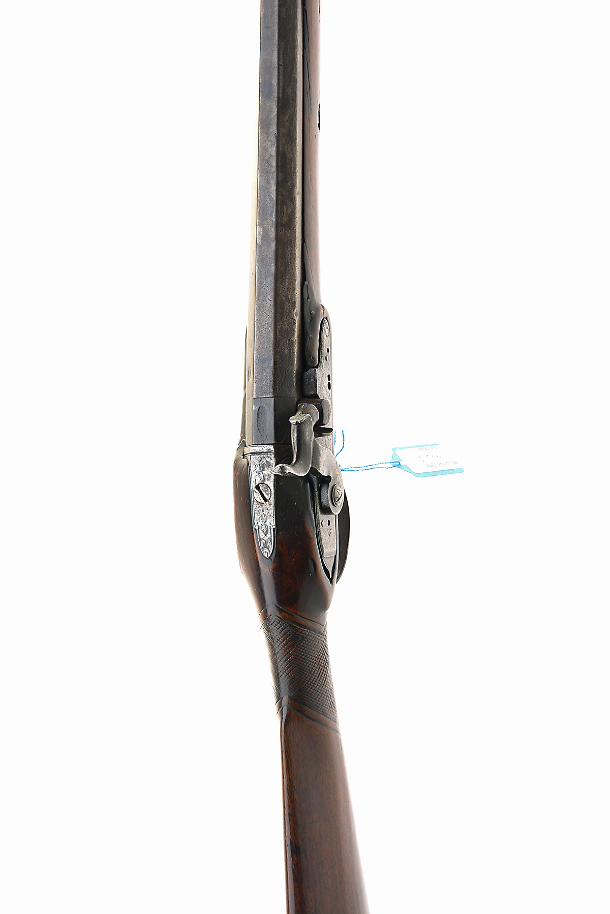 A 16-BORE PERCUSSION SINGLE-BARRELLED SPORTING-GUN POSSIBLY SIGNED HARCOURT, no visible serial number, circa 1780 with later conversion from flint, with 38 1/4in. octagonal to round barrel (rubbed externally), bevel-edged lock with drum and nipple breech, walnut half-stock chequered at the wrist (repairs) brass furniture and replacement trigger guard and lower tang, worn
