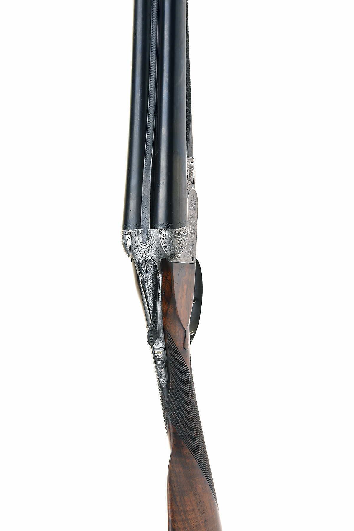 SALMON A PARIS 16-BORE BOXLOCK EJECTOR, serial no. 5557, circa 1930, 26in. nitro reproved 'Acier Cockerill' barrels with sunken rib, 2 1/2in. chambers, bored approx. 1/4 and 1/2 choke, treble-grip action with sideclips, manual peephole safety with gold-inlaid 'SUR' detail, border and acanthus scroll engraving, the underside gold-inlaid 'SALMON A PARIS QUAI DE LA MEGGISIERE', 14 3/8in. figured stock (repaired at hand) including 1in. wooden extension and 1/2in. recoil pad, weight 5lb. 12oz, in a canvas and leather guncase