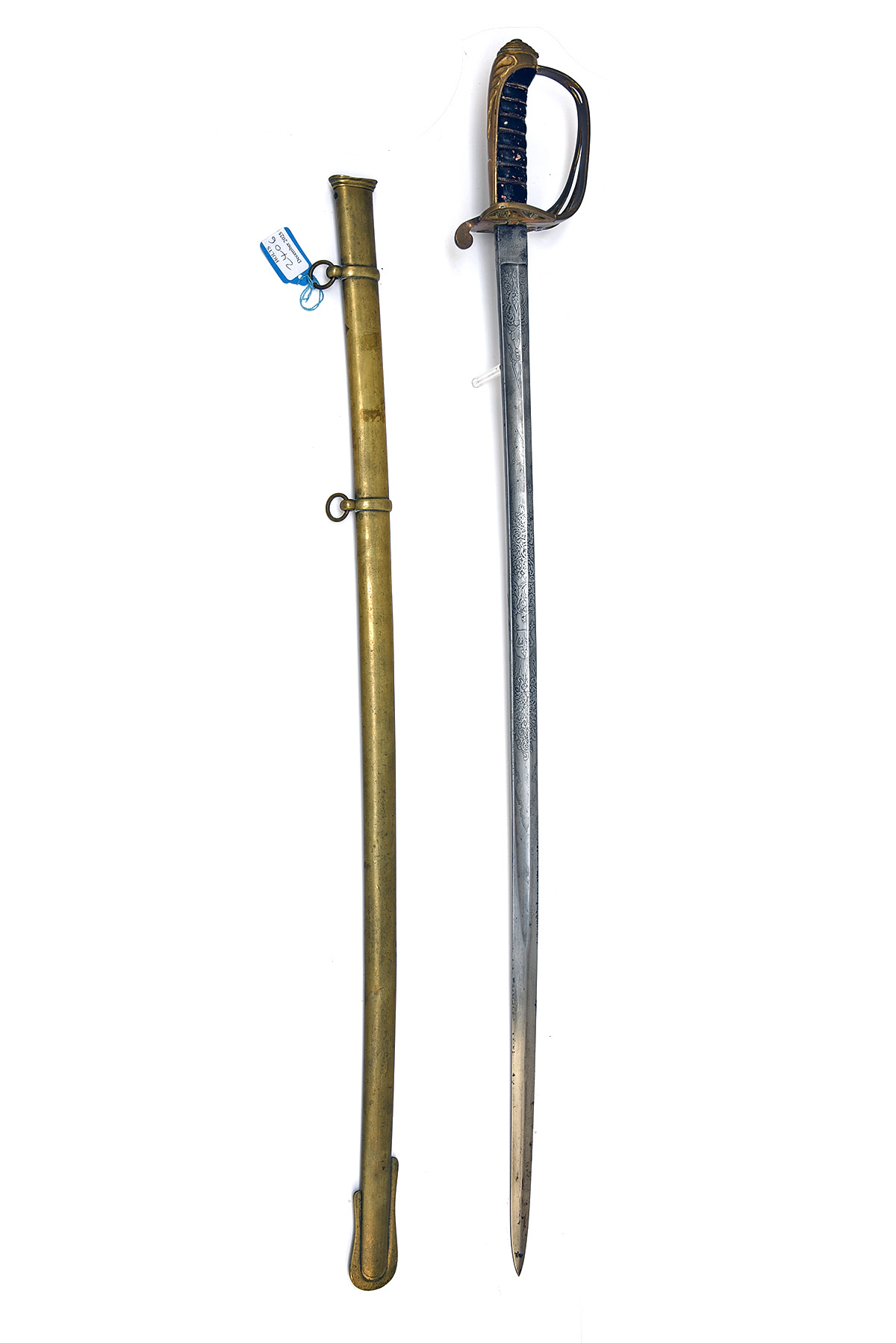 * A PATTERN 1822/45 INFANTRY OFFICER'S SWORD, circa 1850, with 32 1/2 in. single-edged blade, fullered and etched on each side with scrolls and the royal cypher, ricasso marked 'ROGERS & Co. / 40 King St. / Cov'nt Garden / LONDON' brass gothic hilt with folding guard, wire-bound grip, together with its brass scabbard with two suspension rings, guard dented, fish-skin removed from grip and underlying wood painted black, one scabbard throat screw absent, scabbard scratched with shallow denting