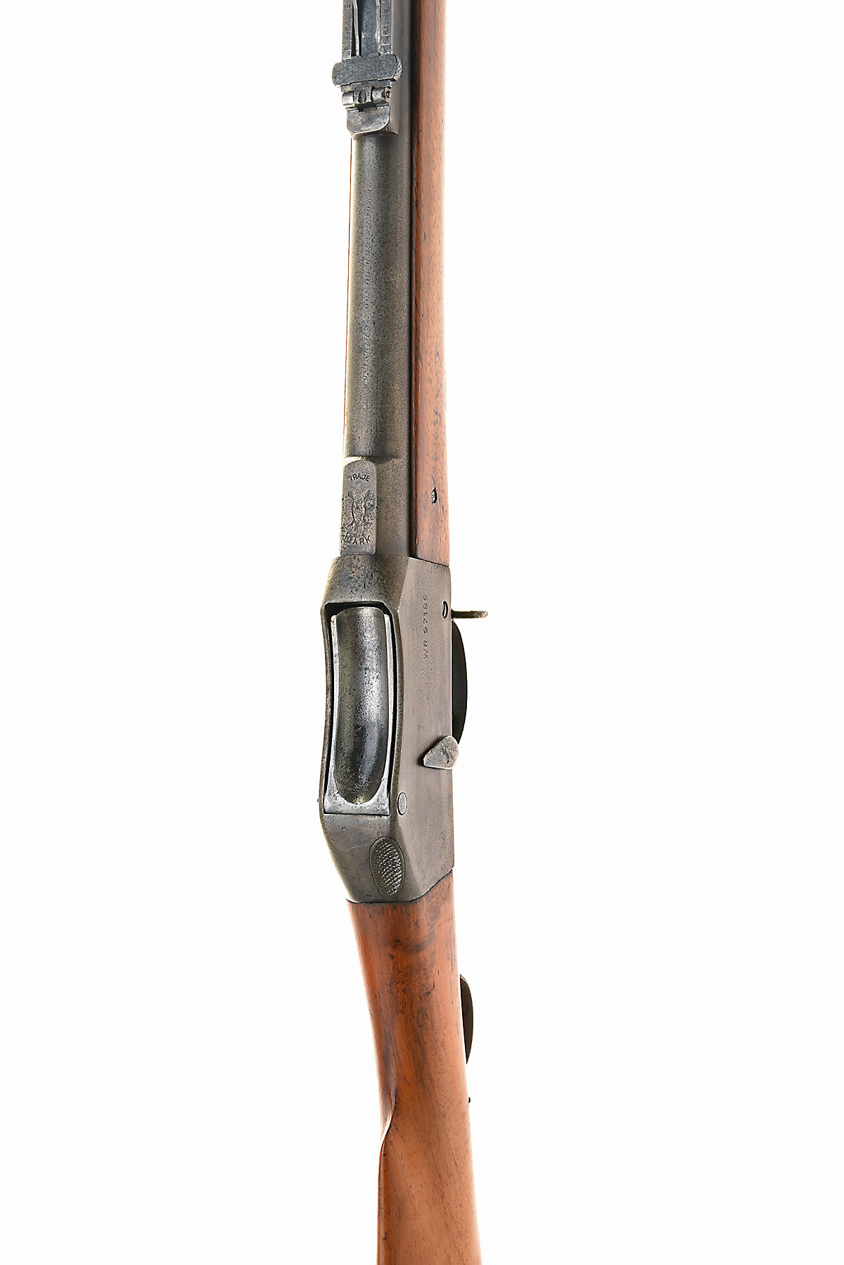 * A .577/450 MARTINI-HENRY COMMERCIAL RIFLE, serial no. WR97189, circa late 19th Century, with 32 1/2 in. sighted barrel, receiver stamped 'WR97189', knoxform with a Zulu shield and spears plus 'TRADE MARK', indistinct maker's details on barrel, some parts with visible inspection and 'WD' marks, all metalwork heavily worn and pitted, butt stained with spliting, clearing rod absent, probably constructed from parts