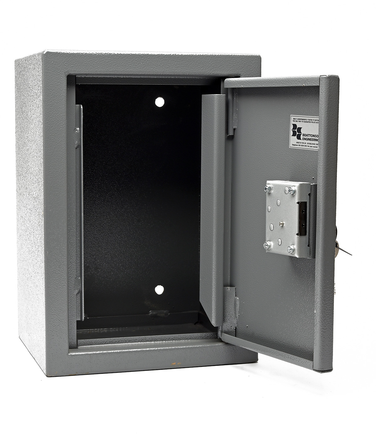 A 'BRATTONSOUND ENGINEERING' STEEL AMMUNITION CABINET, approx. 15in. x 10 1/2in. x 9 1/2in. with keys