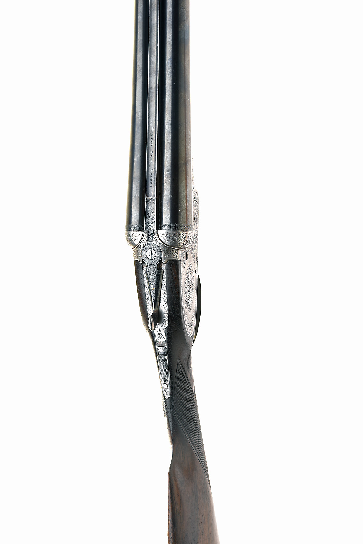 WATSON BROS 12-BORE SIDELOCK EJECTOR, serial no. 7560, for 1912, 28in. replacement nitro barrels, rib engraved 'WATSON BROS.', 2 1/2in. chambers, bored approx. imp. cyl. and 1/2 choke, treble-grip action, toplever gold-inlaid '1', automatic safety with engraved 'SAFE' detail, beaded border and acanthus scroll engraving, brushed finish, 14 1/4in. stock including 7/8in. rubber recoil pad (some leakage around pad), fore-end wood damaged (ejector mechanisms exposed), weight 6lb. 13oz.