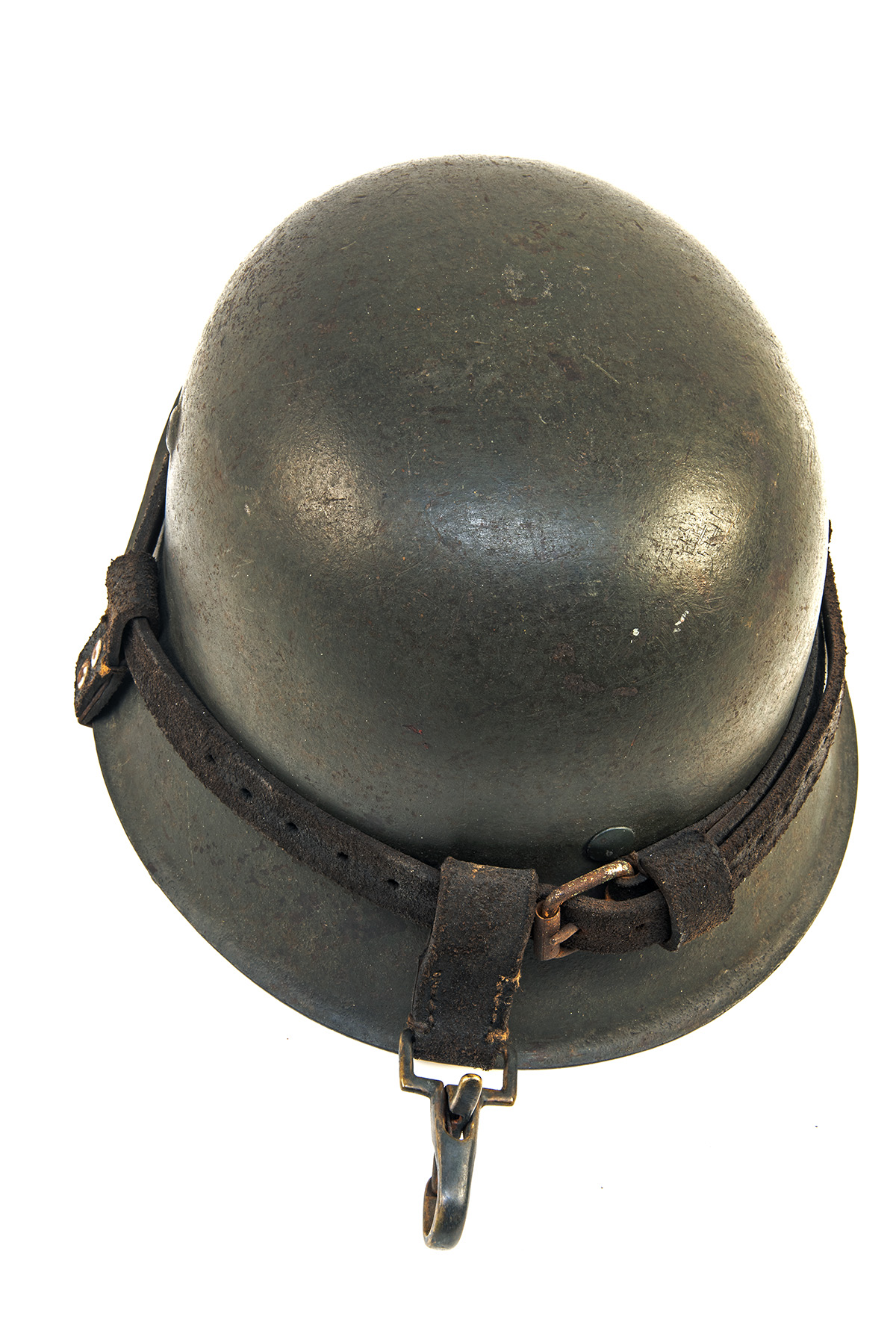all original, shell in excellent condition and stamped 'hk064' and '3846', complete with laced buff leather liner stamped '56' in a circle, leather chin-strap and period external clip-on strapping