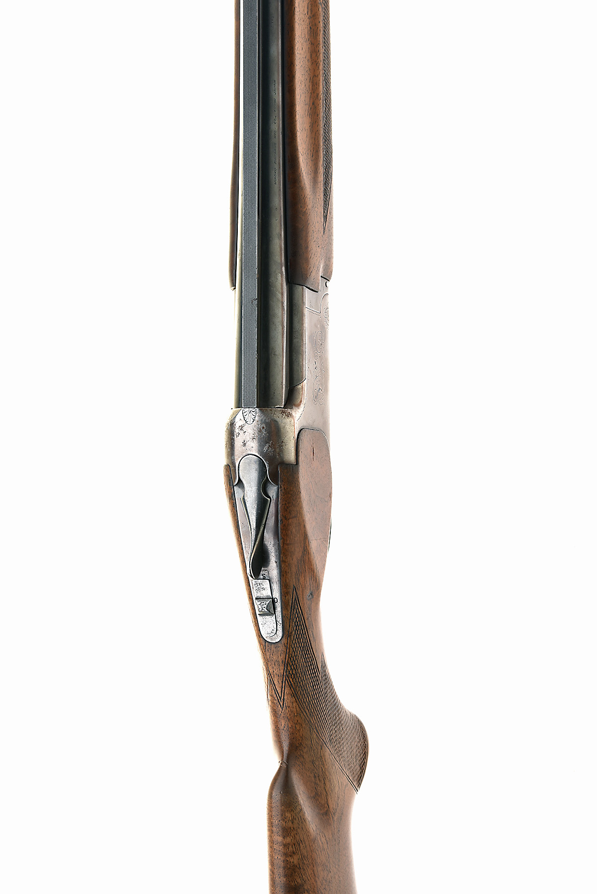 B.C. MIROKU 12-BORE SINGLE-TRIGGER OVER AND UNDER EJECTOR, serial no. 729564, circa 1975, 26in. nitro barrels with 7mm ventilated matt top-rib, 2 3/4in. chambers, bored approx. 1/4 and 1/2 choke, hold-open toplever, manual safety with integral barrel selector switch, border and partial scroll engraving, 14 1/4in. pistolgrip stock including buttplate, weight 7lb. 5oz.