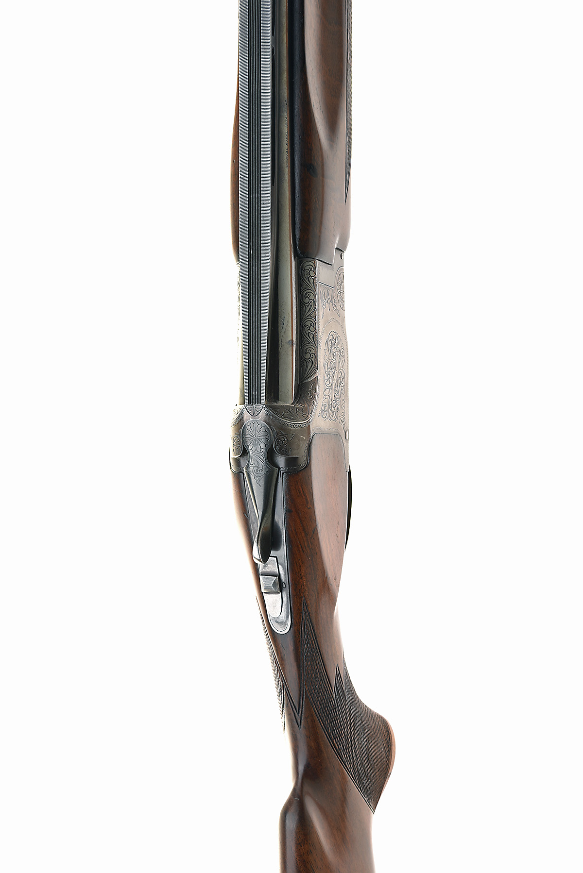 B.C. MIROKU 12-BORE SINGLE-TRIGGER OVER AND UNDER EJECTOR, serial no. 60279PZ, dated 1985, 32in. nitro barrels with 15mm ventilated matt top-rib, 2 3/4in. chambers, bored approx. 3/4 and full choke, hold-open toplever, manual safety with integral barrel selector switch, beaded border and acanthus scroll engraving, 14 1/4in. pistolgrip stock including 1in. rubber recoil pad, weight 8lb. 10oz.