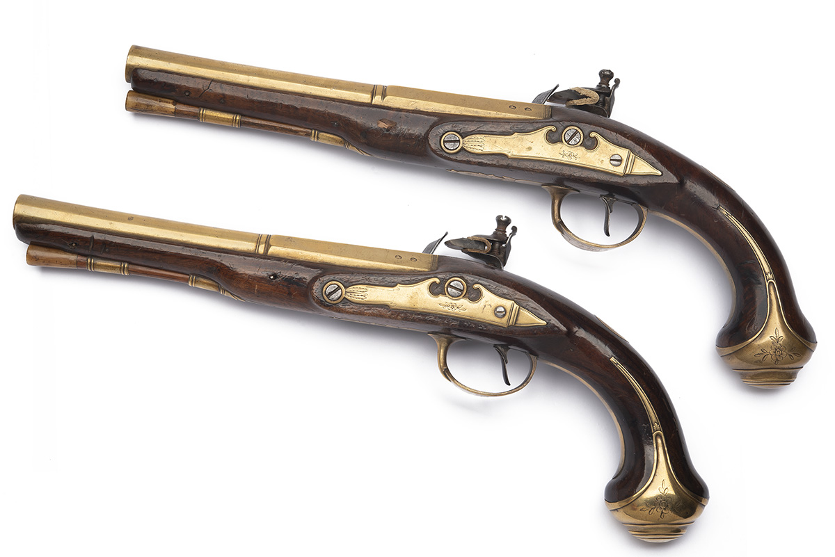 circa 1785, with brass two-stage slightly swamped 8 1/2in. barrels, moulded girdles at the intersection, iron top-tangs, flat brass lockplates with pointed and stepped tails, iron swan-necked cocks with bolted safes, bridled pans with 'J. PROBIN' signature below, walnut full-stocks with brass furniture including engraved butt-caps with long side-spurs, pillar fronted trigger guard bows, pineapple finials and horn tipped wood ramrods