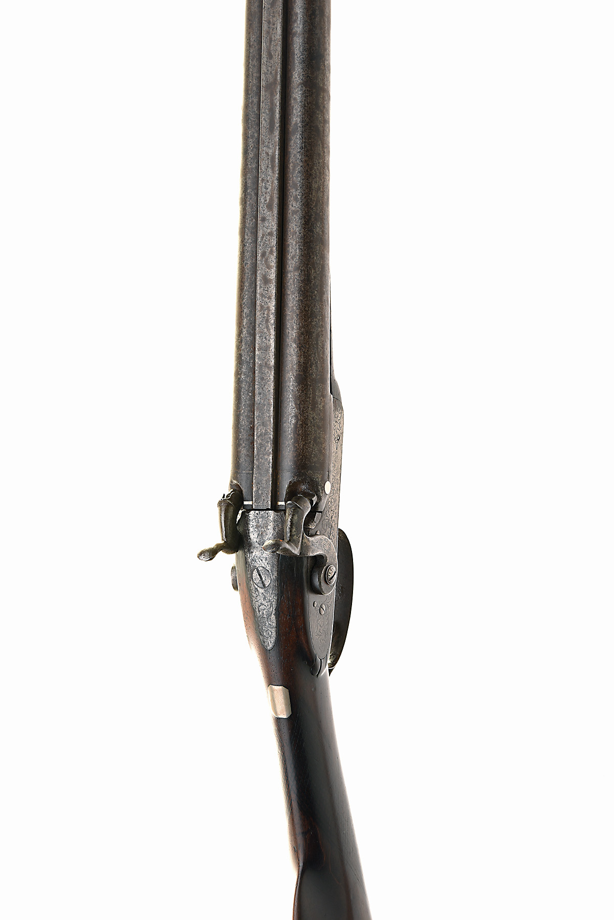 A 14-BORE PERCUSSION DOUBLE-BARRELLED SPORTING-GUN SIGNED AKRILL, no visible serial number,
