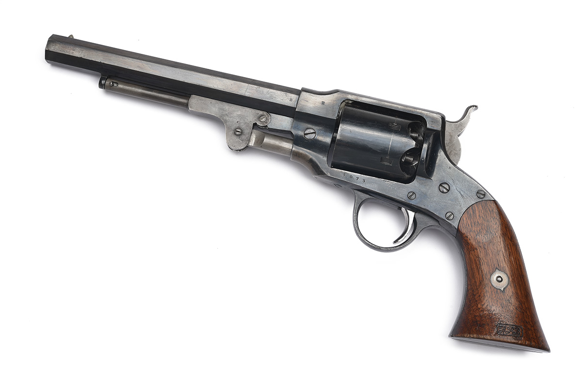 circa 1865, with blued octagonal 7 1/2in. barrel, conical bead fore-sight, sighting groove to the top-strap, the latter also signed 'ROGERS & SPENCER' and 'UTICA N-Y' on opposing sides, blued solid frame, blued plain six-shot cylinder, smooth flared walnut grips with clear martial cartouche and colour hardened rammer and hammer, much finish throughout