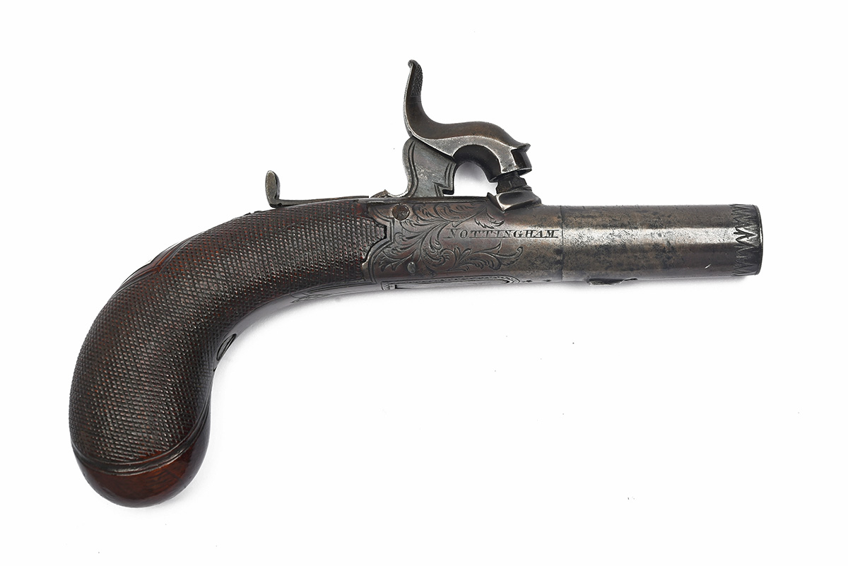 A 100-BORE PERCUSSION MUFF-PISTOL OF SMALLER SIZE SIGNED JACKSON, NOTTINGHAM, no visible serial number, circa 1830, with round tapering 1 1/2in. barrel (frozen), engraved band at muzzle, scroll engraved rounded boxlock action with signature, central hammer and concealed automatic trigger, finely chequered bag-shaped grip and top-tang safe