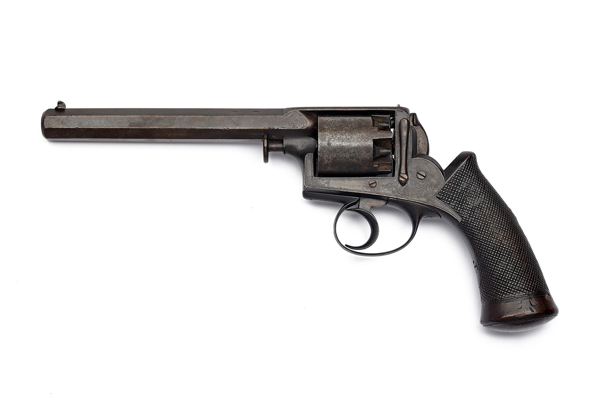 circa 1852, with octagonal 6 1/2in. barrel, the top-strap and top-flat of barrel with signature 'DEANE ADAMS & DEANE (MAKERS TO H.R.H. PRINCE ALBERT) 30 KING WILLIAM ST'T LONDON', borderline and scroll engraved action, plain five-shot cylinder, spurless hammer, guarded trigger and chequered walnut grip with domed iron cap with central trap, no provision for rammer, the whole darkly stained