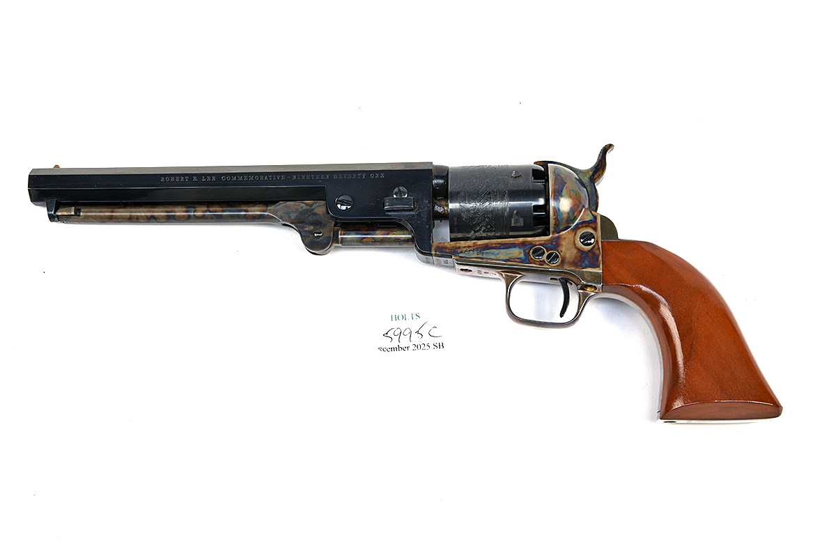 A CASED COLT USA .36 PERCUSSION SIX-SHOT REVOLVER, MODEL 1851 NAVY' "ROBERT E. LEE COMMEMORATIVE", serial no. REL4509, for 1971, with 7 1/2in. blued barrel engraved 'ROBERT E. LEE COMMEMORATIVE - NINETEEN SEVENTY ONE', blued cylinder roll-engraved with naval engagement scene, case-hardened frame, silver-plated grip-straps and trigger-guard and fitted with a smooth walnut grip, together with its manufacturers original lined and fitted case with powder-flask, bullet mould, nipple-wrench and cap tin and original makers carton