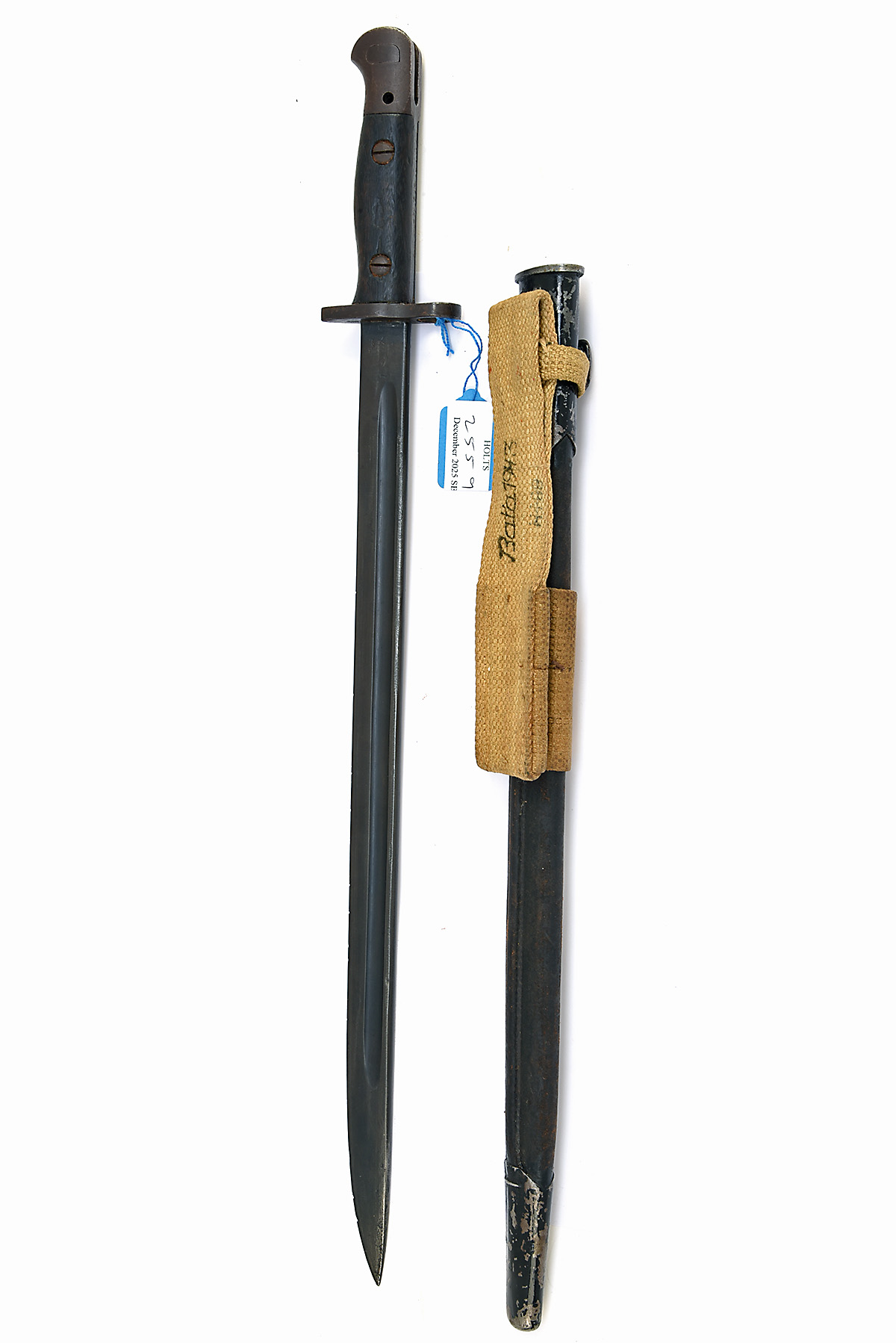 A BETTER PATTERN 1907 SWORD BAYONET BY WILKINSON, dated 1918, 17 in. single-edged blade, fullered on each side, ricasso marked king's crown above 1907 above WILKINSON, with Broad Arrow, inspection marks and bend test 'X' over, riveted wooden grips with inspection marks, black leather scabbard with black painted fittings and canvas frog marked 'Bata 1943' on the back