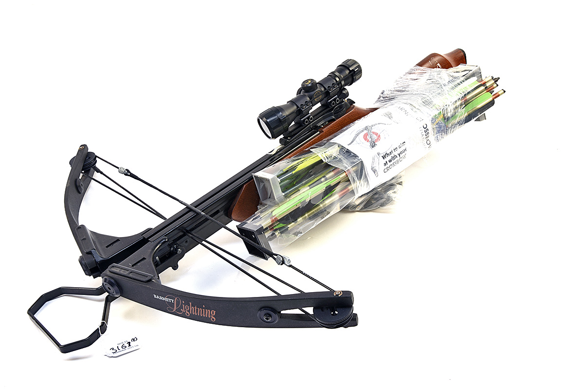 A LIGHTLY USED 'BARNETT' LIGHTNING COMPOUND CROSSBOW, 'BARNETT' 4X32 SCOPE, FIFTEEN UNUSED BOLTS AND SPARE PARTS, wood stock, 150lb draw weight, 50m effective range, 10 'BARNETT' 16in. bolts, 5 'BARNETT' 20in. bolts in original packaging, includes spare bow arms, string and related items (2)