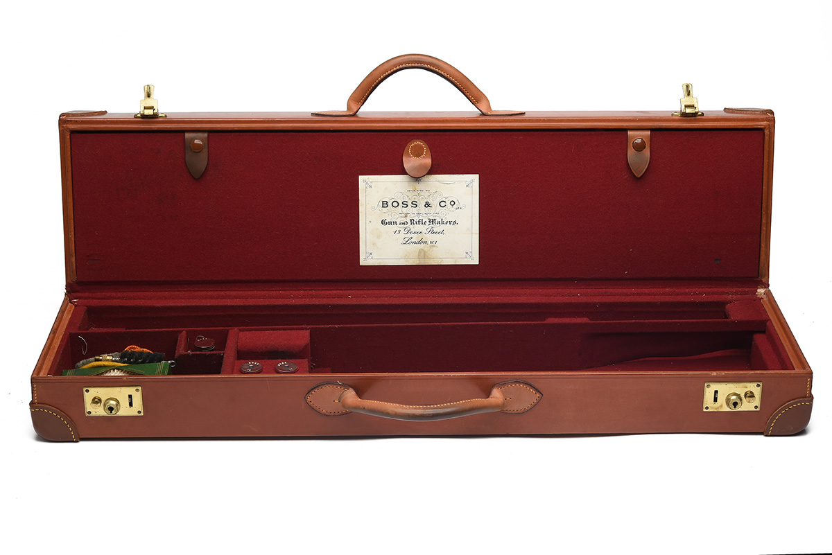 fitted for 28in. barrels (would adapt to 29in.), red baize interior, inner flap with Boss & Co. 13 Dover Street London W.1. trade label, a pair of nickel plated 12-bore snapcaps marked 'BOSS & CO.' and a pair of nickel plated 12-bore snapcaps and a nickel plated oil bottle marked 'BOSS', two brass locks (no keys), lid exterior with leather panel initialled 'R.W.H.'