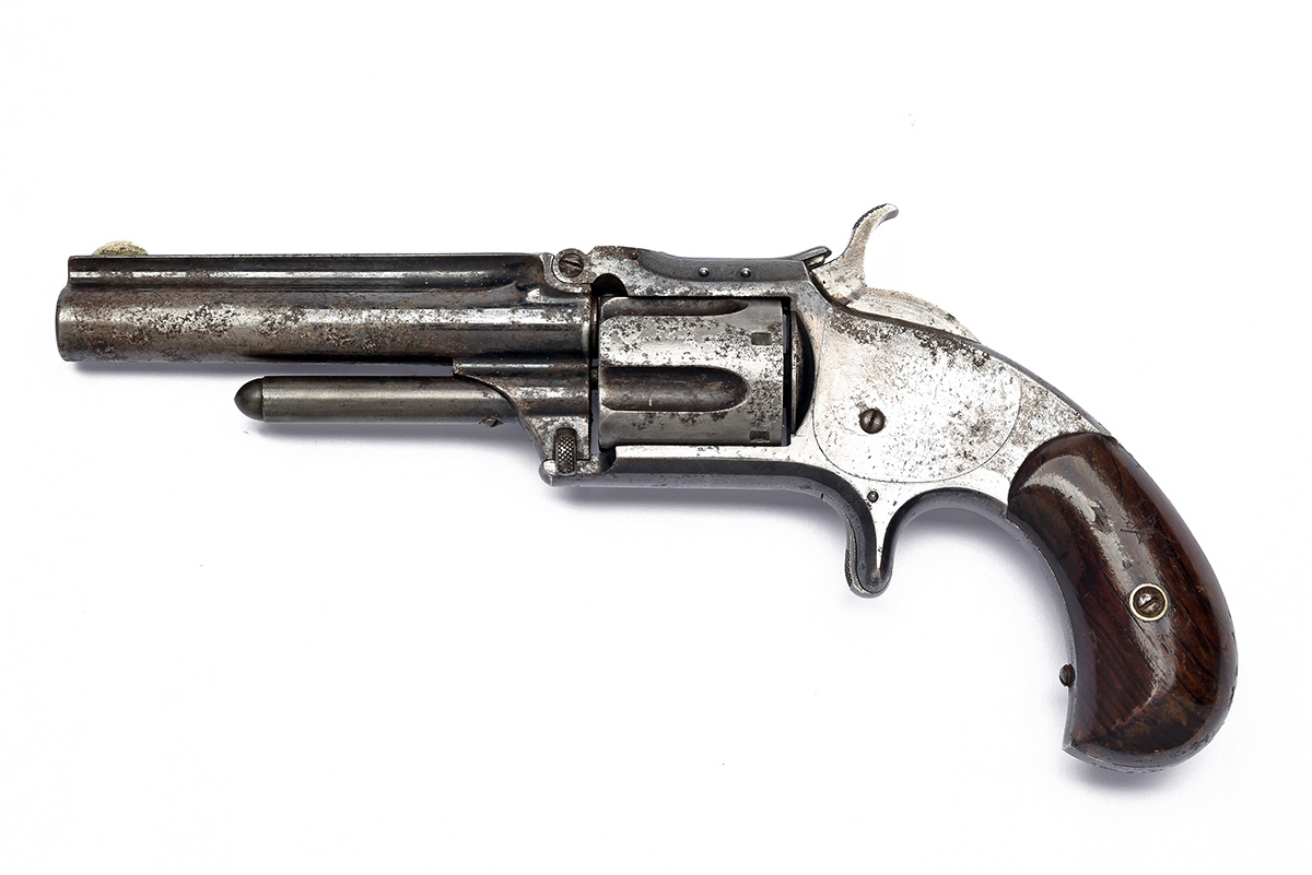 A .32 RIMFIRE SMITH & WESSON MODEL 1 1/2 REVOLVER, serial no. 84814, second issue circa 1873, with blued 3 1/2in. tip-up barrel, fluted five-shot cylinder, blued frame with spur trigger and smooth walnut birdshead grips, fair traces of finish