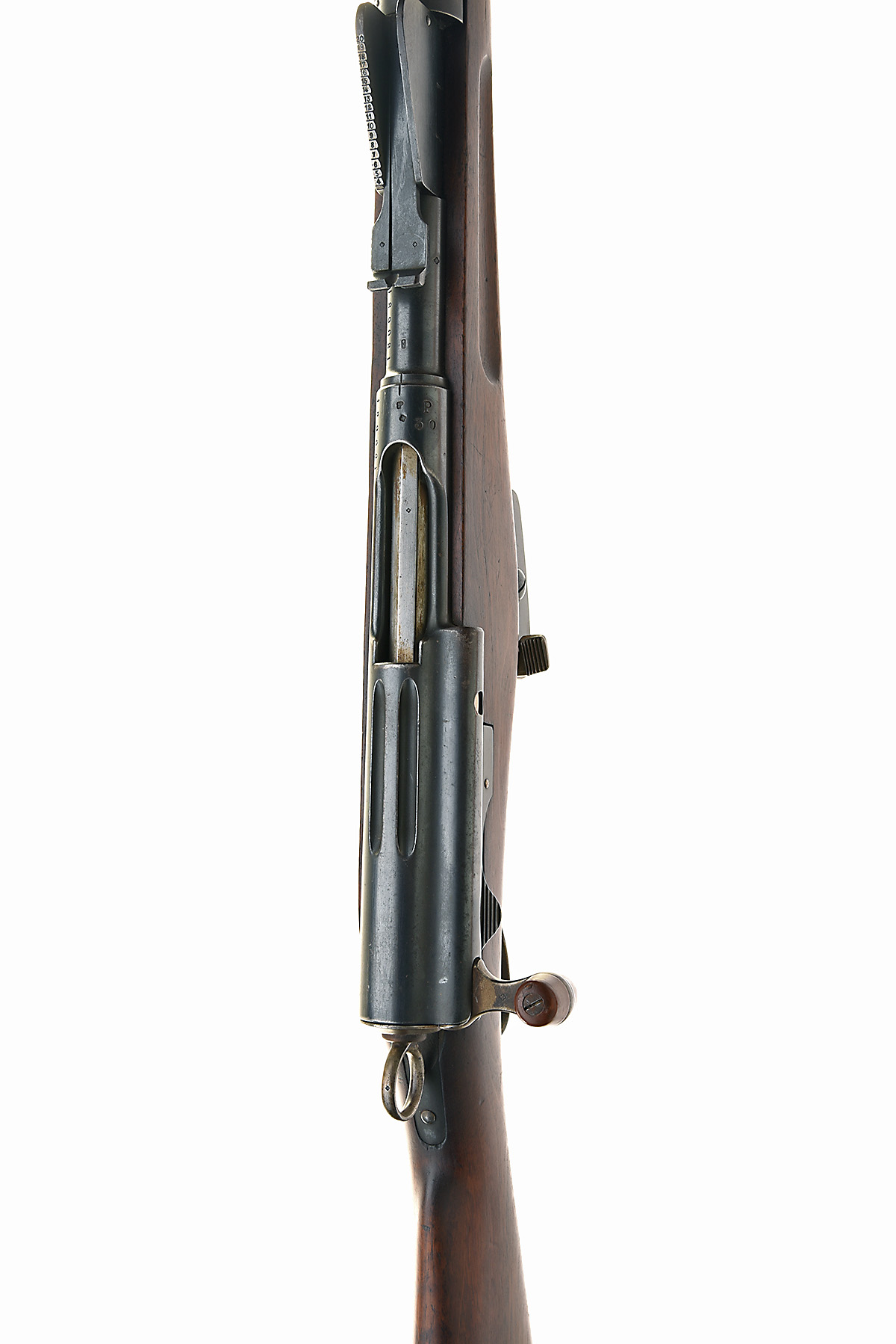 A 7.5x53.5mm (SWISS) STRAIGHT-PULL SERVICE-RIFLE, UNSIGNED, MODEL 'M1889 SCHMIDT-RUBIN', serial no. 189081, circa 1892, with blued 30 3/4in. barrel, blade fore-sight, tangent rear-sight, blind-fluted receiver with straight handled bolt fitted with bakelite toggle-ends, ring safe to rear, walnut full-stock, blued steel furniture including box magazine and twin barrel-bands, all matching visible numbers
