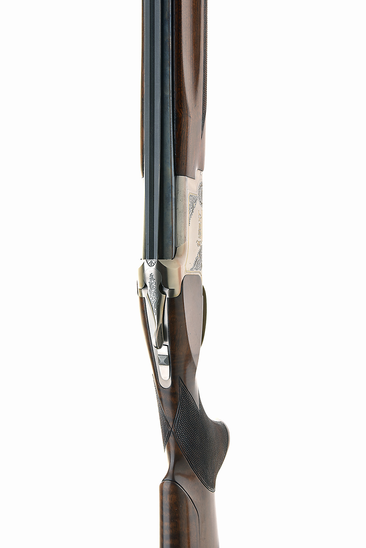 BROWNING 12-BORE 'ULTRA XT' SINGLE-TRIGGER OVER AND UNDER EJECTOR, serial no. 45187MM, dated 2000, 32in. nitro barrels with 12mm ventilated matt top-rib, 2 3/4in. chambers, bored approx. full choke in both, hold-open toplever, manual safety with integral barrel selector switch, gold-washed adjustable single trigger, partial acanthus scroll with gold bordering, 15in. pistolgrip stock with adjustable comb, including 1in. ventilated rubber recoil pad, weight 8lb. 9oz., in its makers aluminium travel case