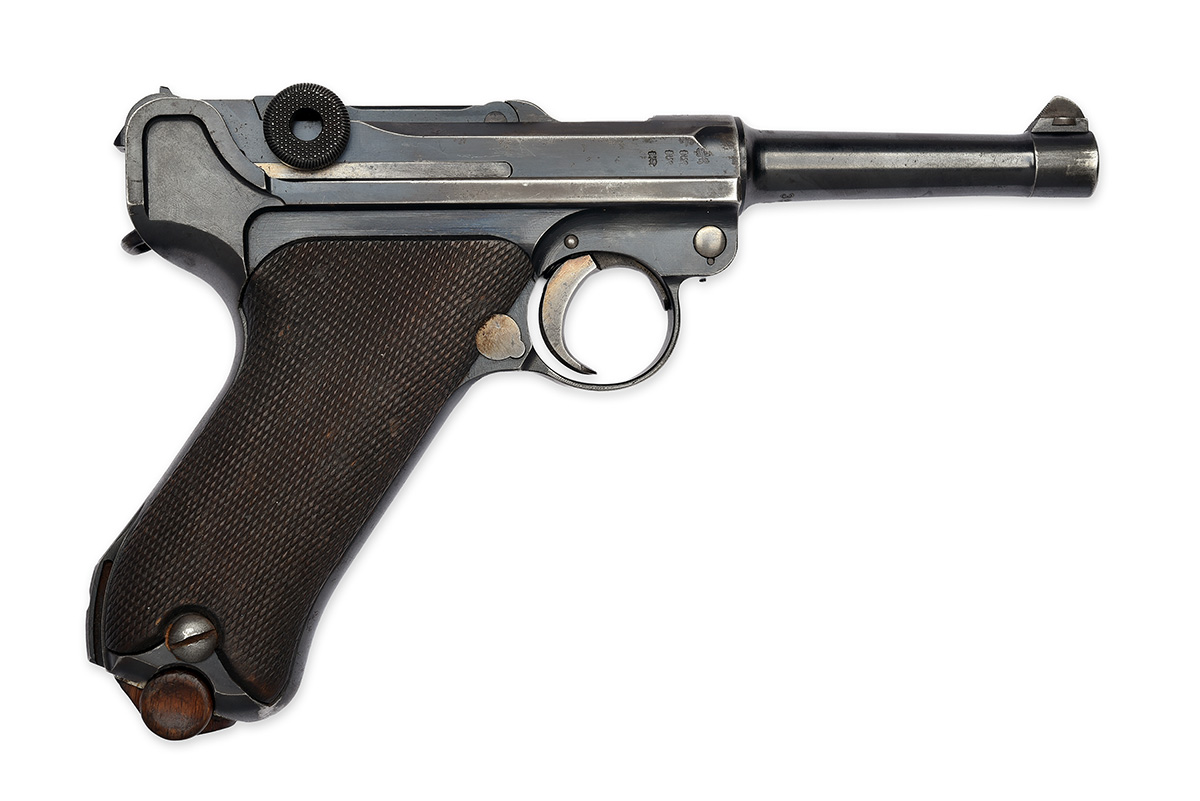 the pistol dated for 1915, with blued 4in. barrel, blade fore-sight, dated nocksform, 'DWM' manufacturer's mark to the top of toggle, blued receiver and frame, chequered walnut grips, provision for stockboard and wood based magazine, all matching numbers except magazine and with a certificate of proof