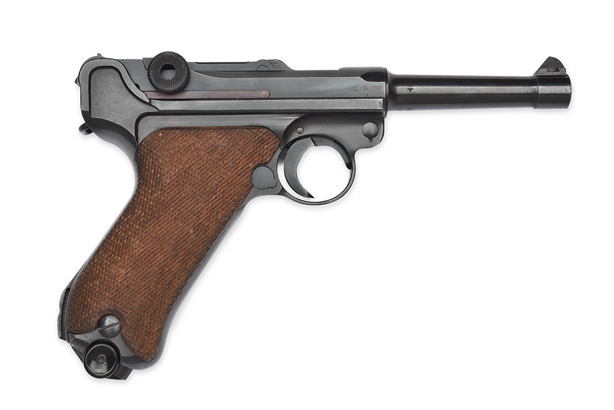 the pistol dated for 1941, with blued 4in. barrel, blade fore-sight, dated nocksform, 'BYF' manufacturer's code to the top of toggle, blued receiver and frame, chequered walnut grips, provision for stockboard and bakelite based magazine, all matching numbers except magazine and in a blackened brown leather service holster dated '1939' and signed 'VOEGELS KOLN', the reverse also marked with a waffenampt stamp, with a similar spare period magazine, stripping tool and certificate of proof