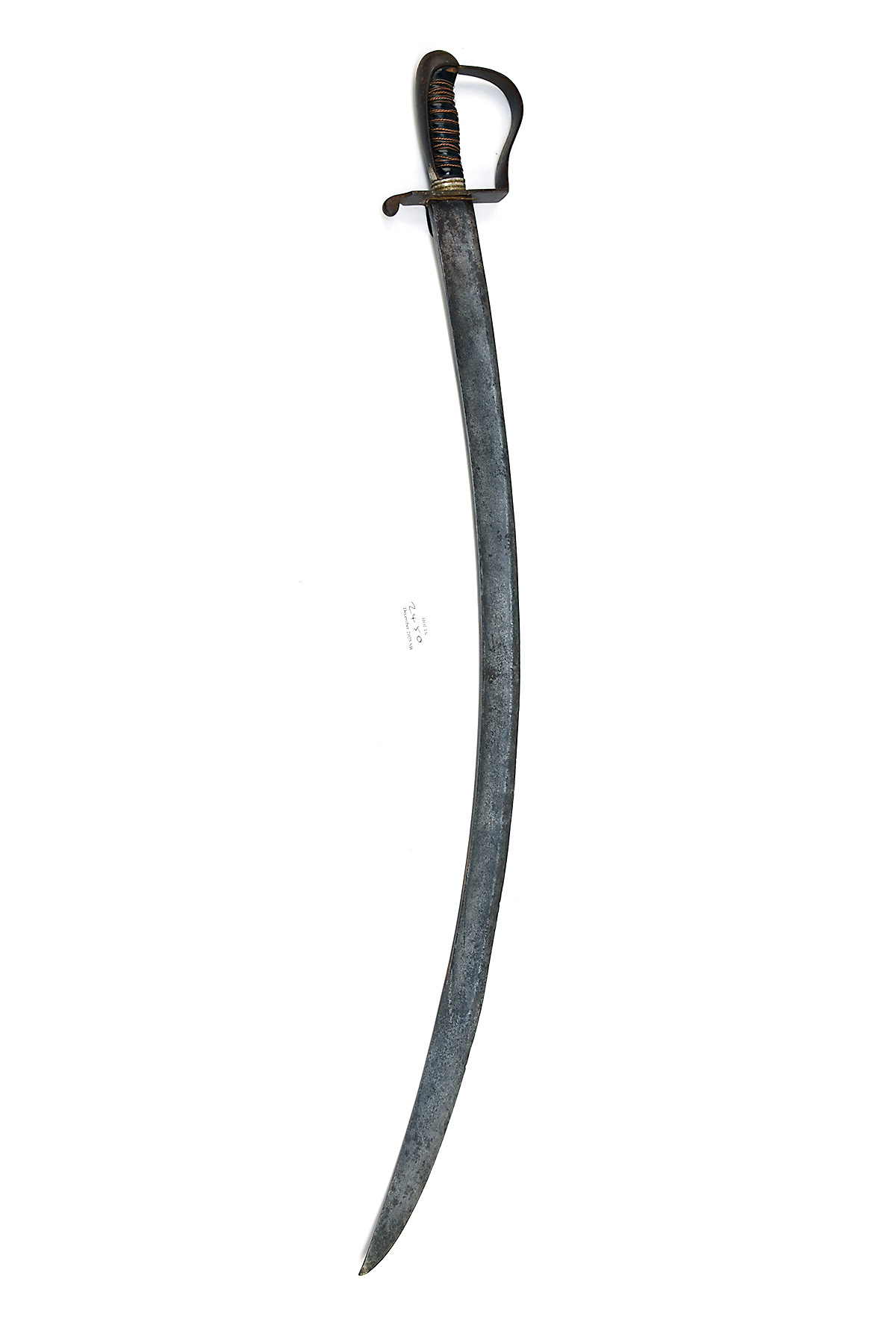 * AN UNKNOWN CONTINENTAL CAVALRY SABRE, circa 1890, with 33 in. single-edged blade fullered on each side, steel hilt with a single front-facing langet showing a lion passant wearing a mitre and carrying a banner, wire-bound cellulose grip, heavily worn, blade bend and chipped, cellulose cracked with losses, wire binding loose